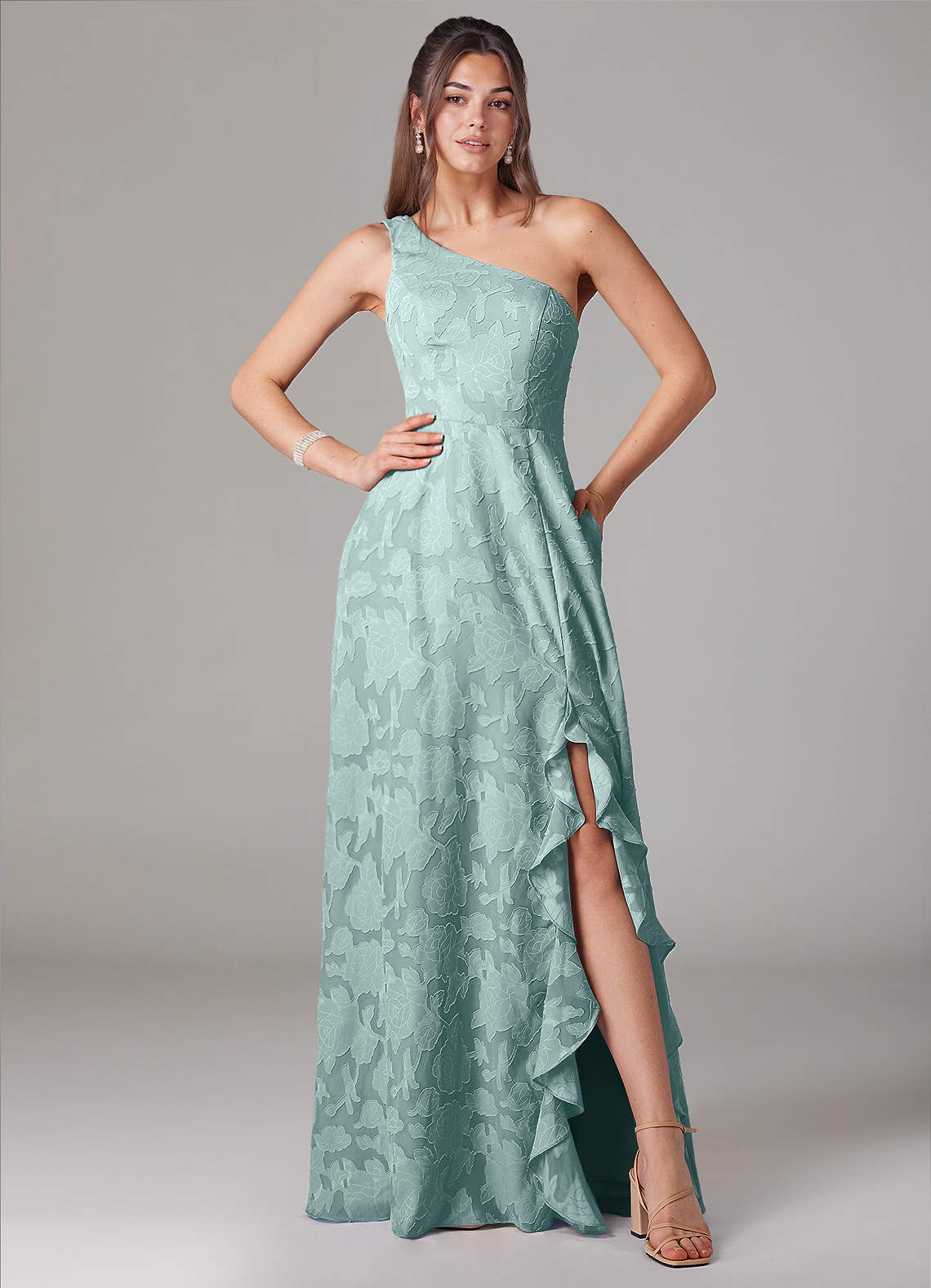 A라인 한쪽 어깨 플로럴 번아웃 바닥 길이 드레스