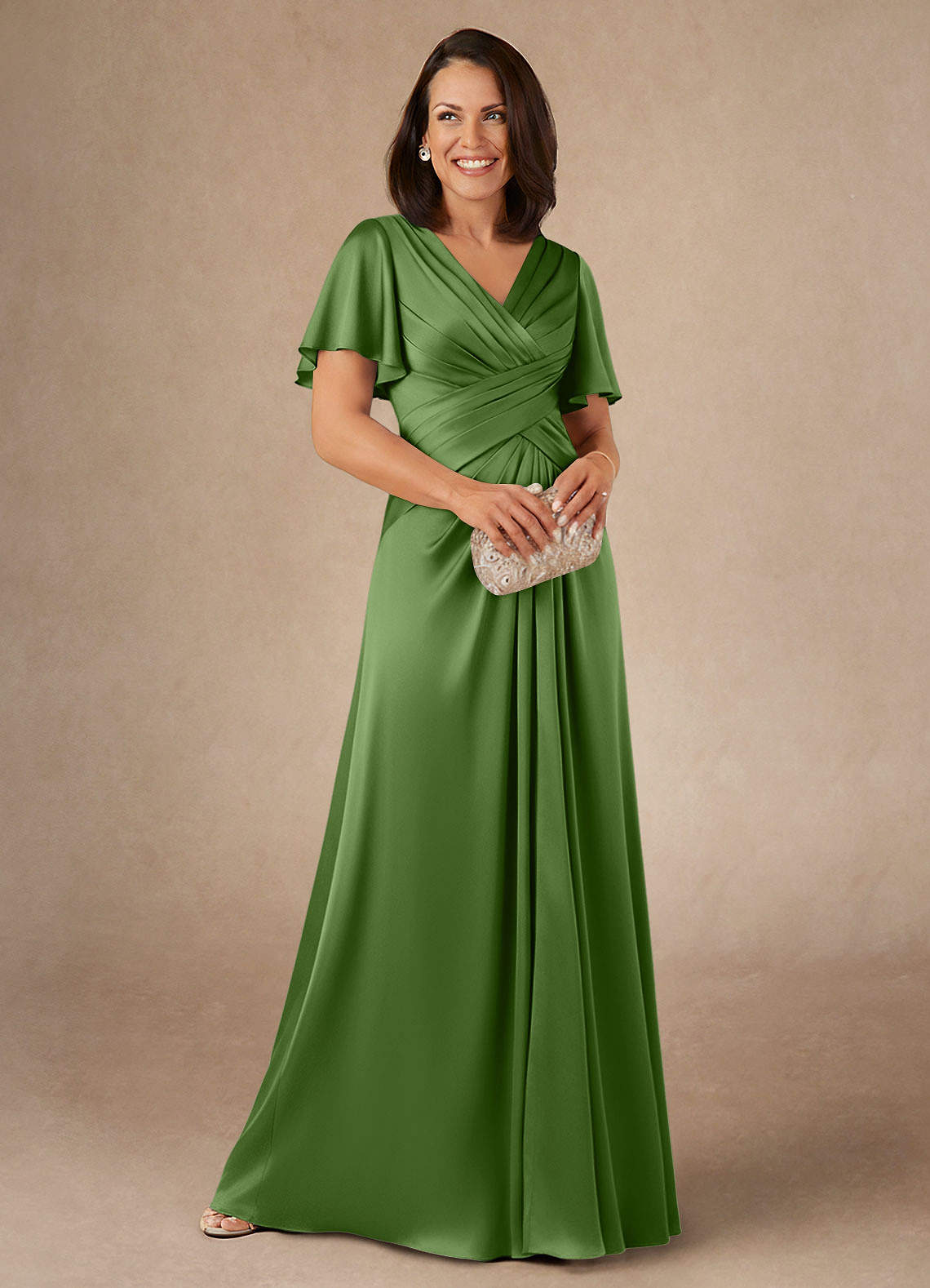 A라인 주름진 스트레치 새틴 플로어 길이 드레스