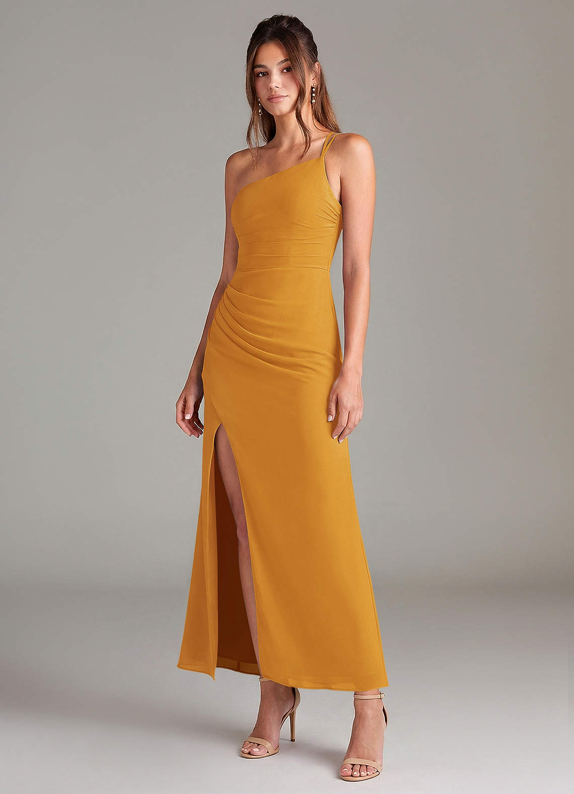 Azazie Eren 신부 들러리 드레스 인어 한쪽 어깨 쉬폰 발목 길이 드레스 image1