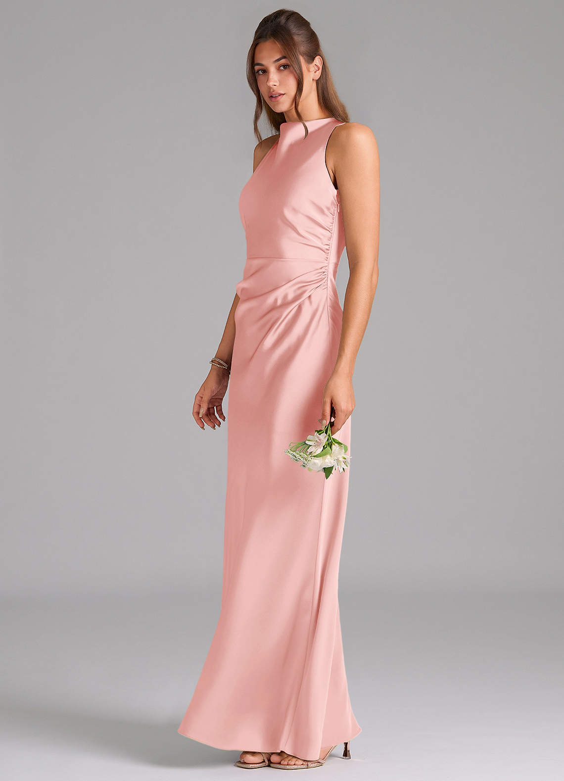 쉬스 주름진 스트레치 새틴 바닥 길이 드레스