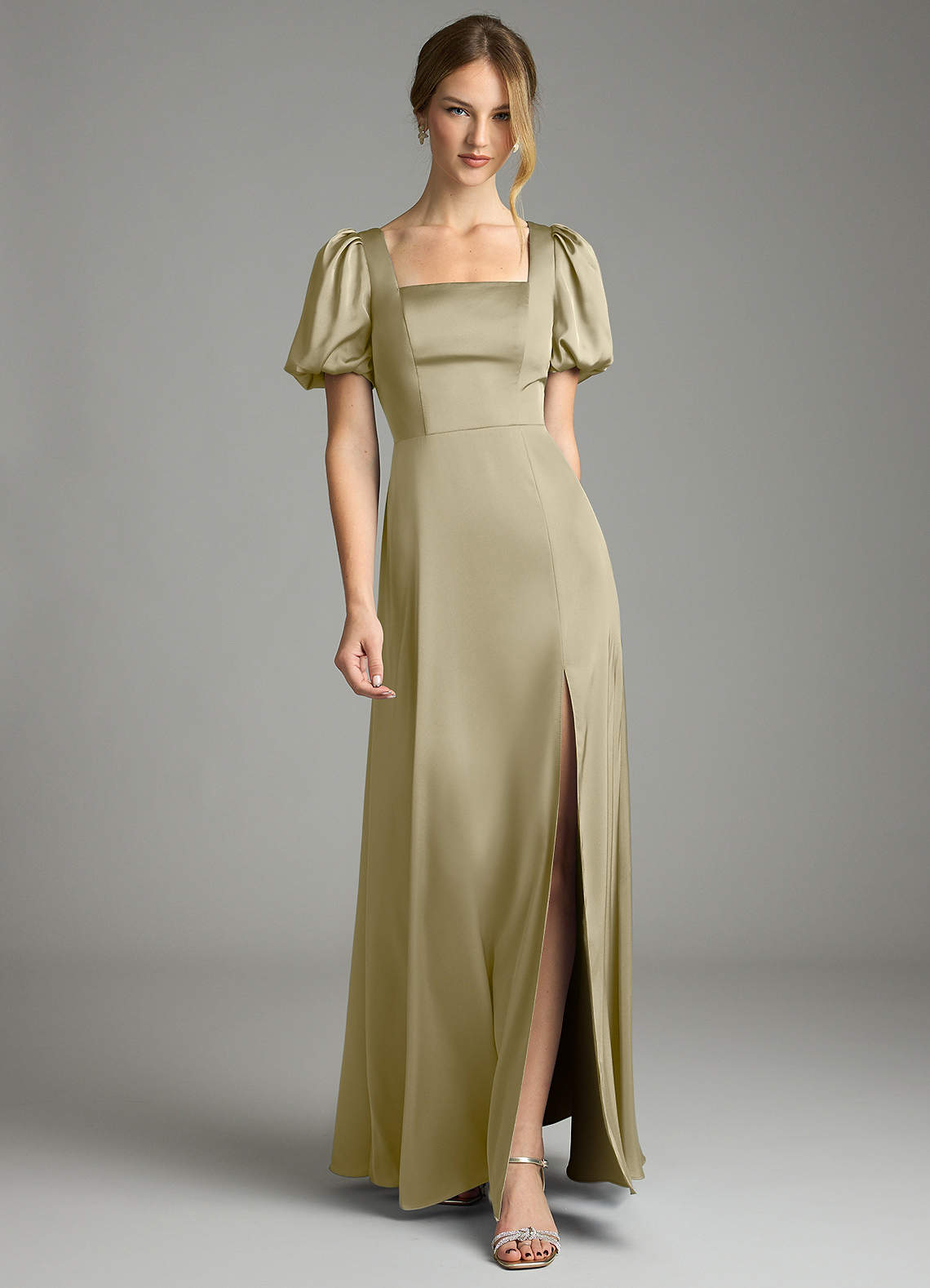 A라인 주름진 스트레치 새틴 바닥 길이 드레스