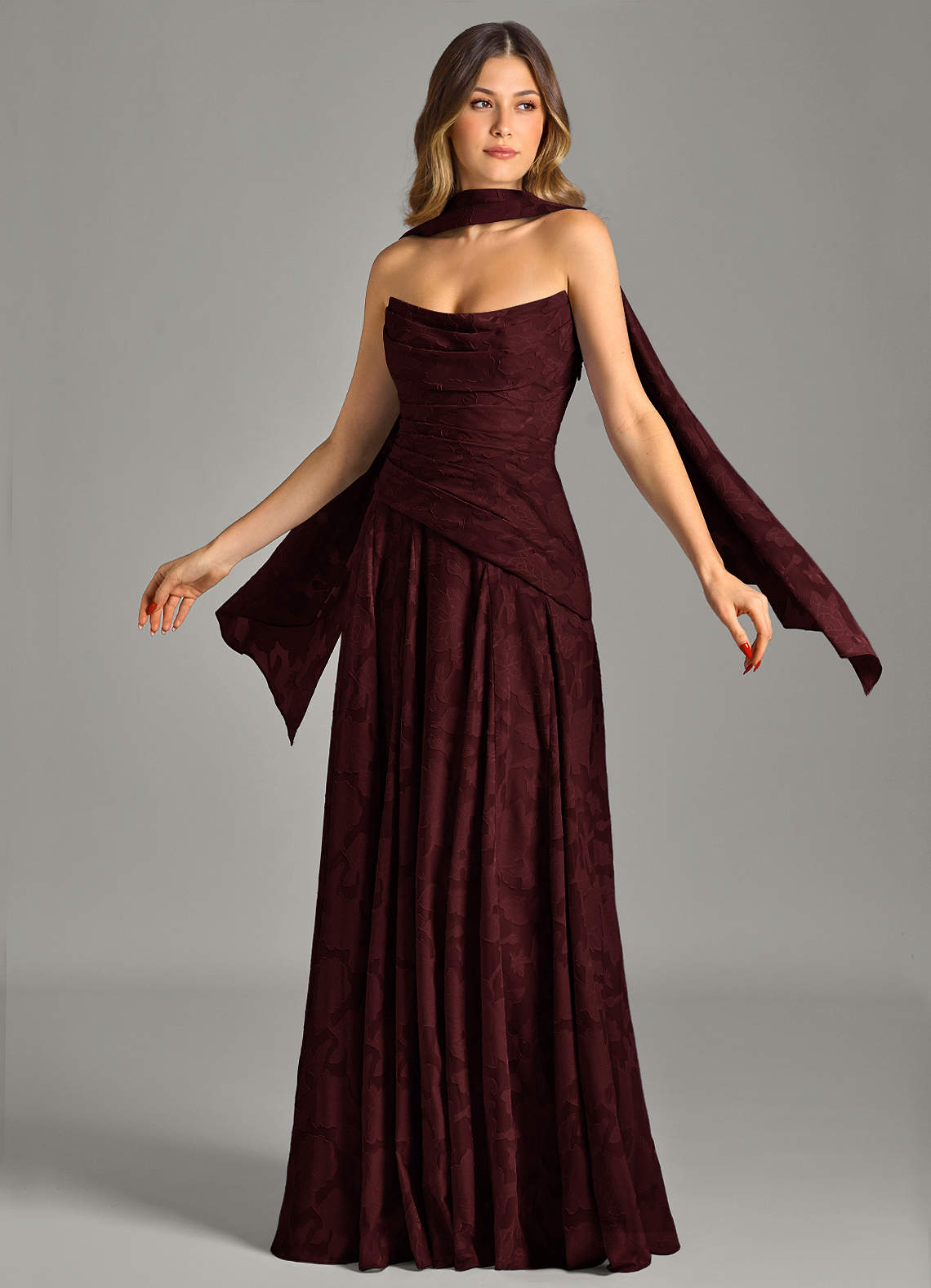 A라인 스트랩리스 플로럴 번아웃 바닥 길이 드레스
