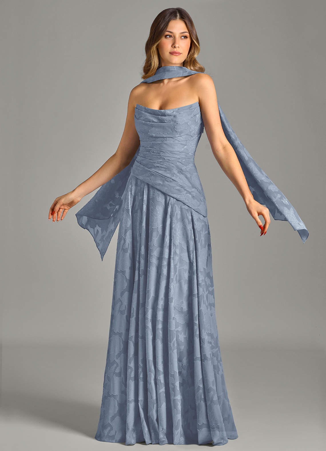 A라인 스트랩리스 플로럴 번아웃 바닥 길이 드레스