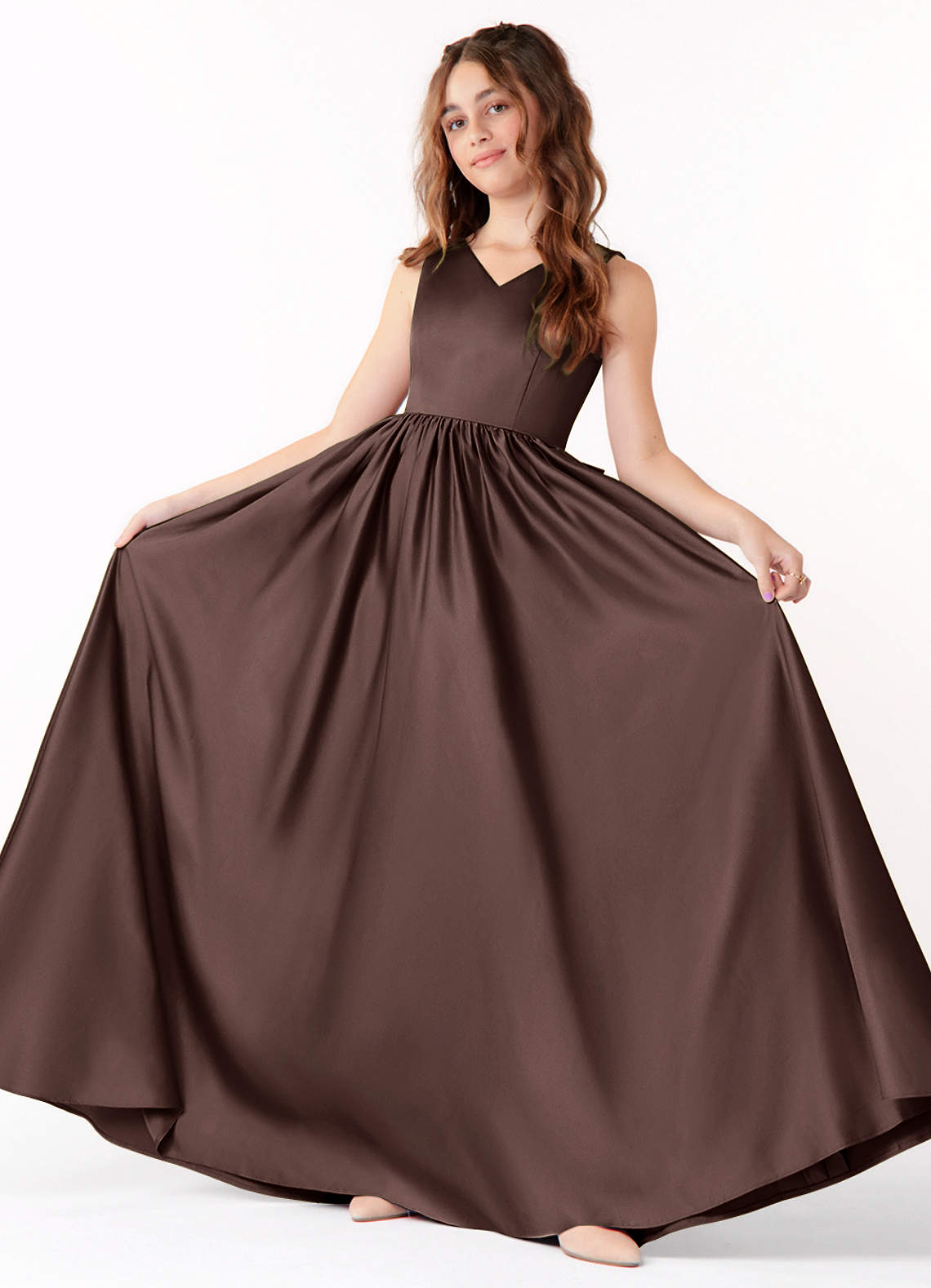 A라인 절하다 스트레치 새틴 플로어 길이 주니어 신부 들러리 드레스