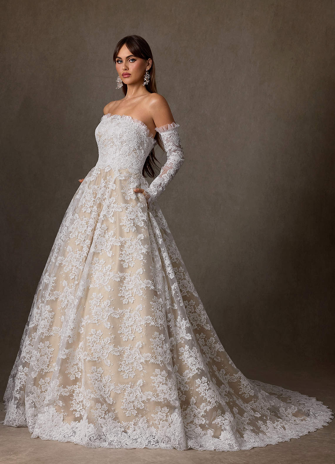 볼가운 스트랩리스 레이스 채플 트레인 드레스