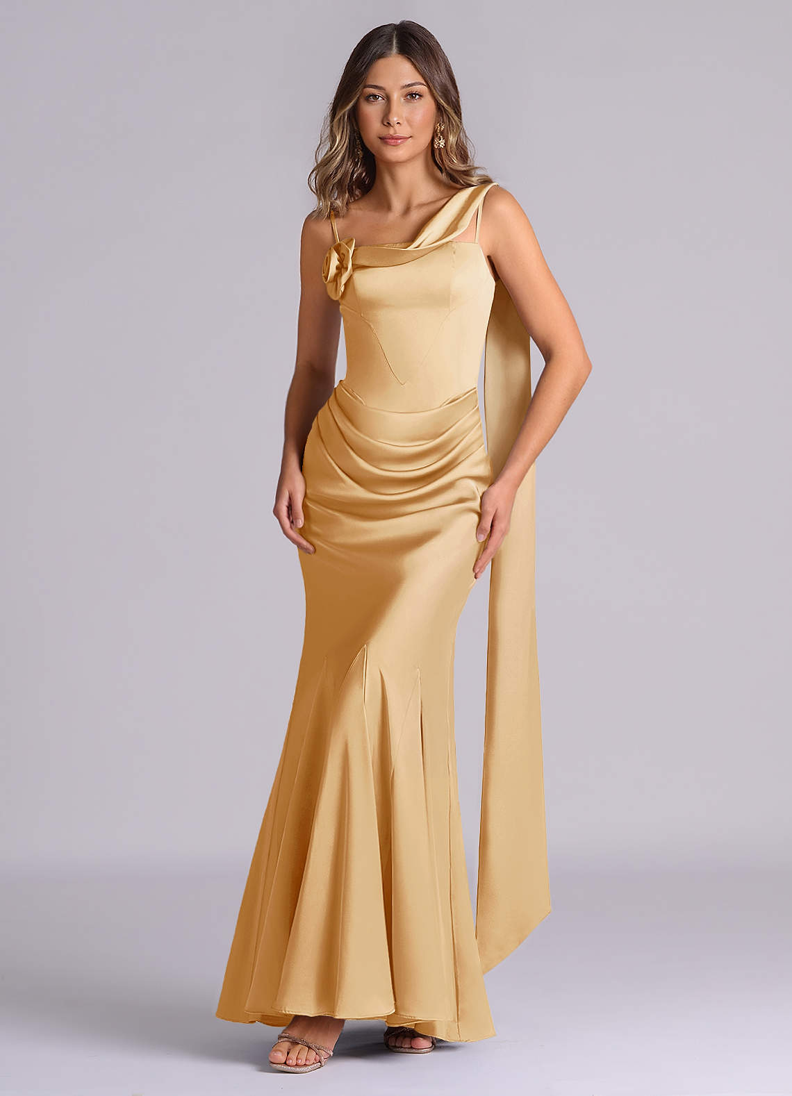 인어 주름진 스트레치 새틴 바닥 길이 드레스