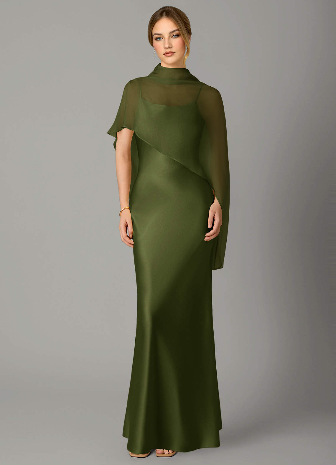A라인 하이넥 스트레치 새틴 바닥 길이 드레스