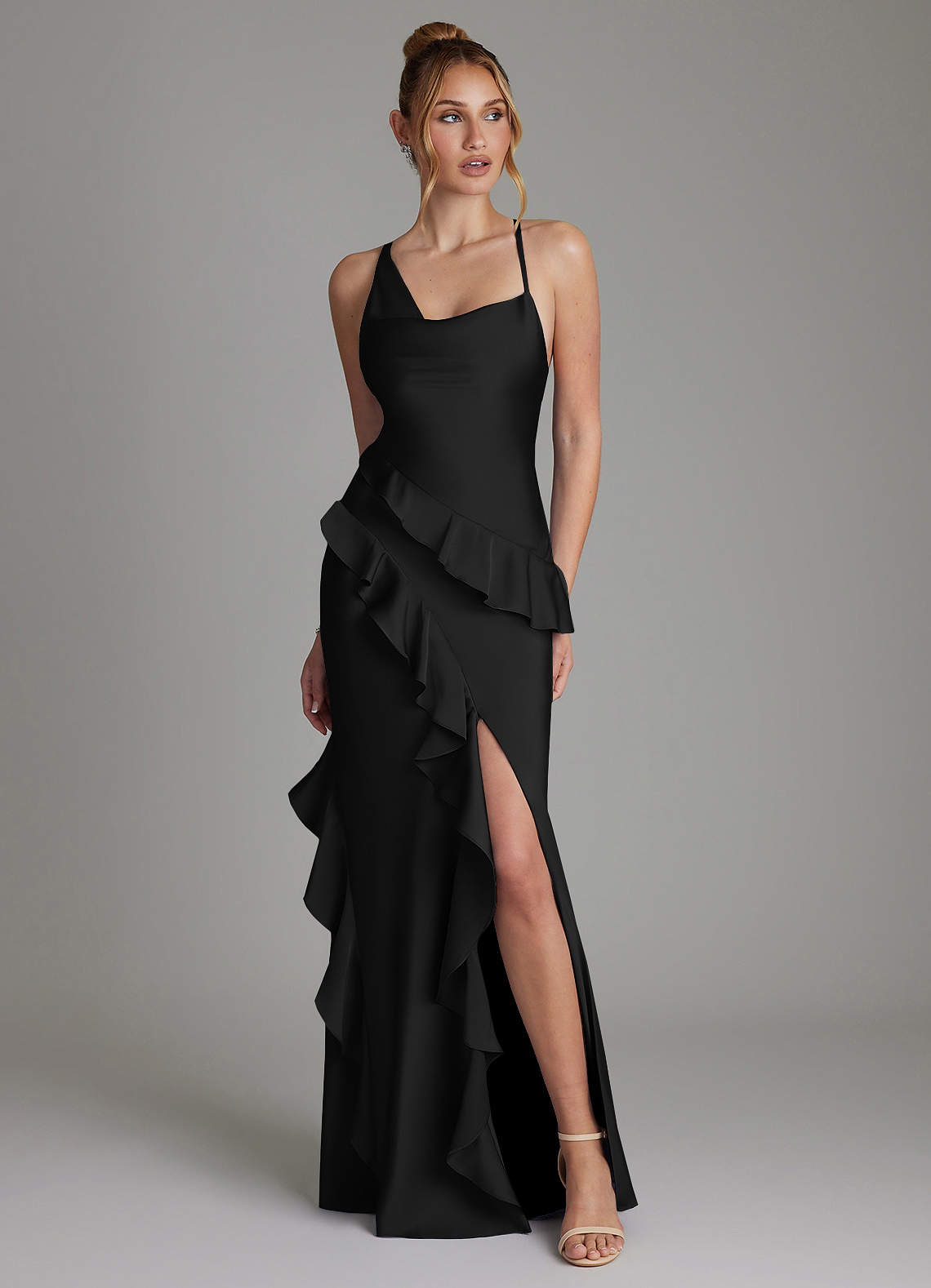 Azazie Jayda 신부 들러리 드레스 A라인 셔링 스트레치 새틴 바닥 길이 드레스 image1