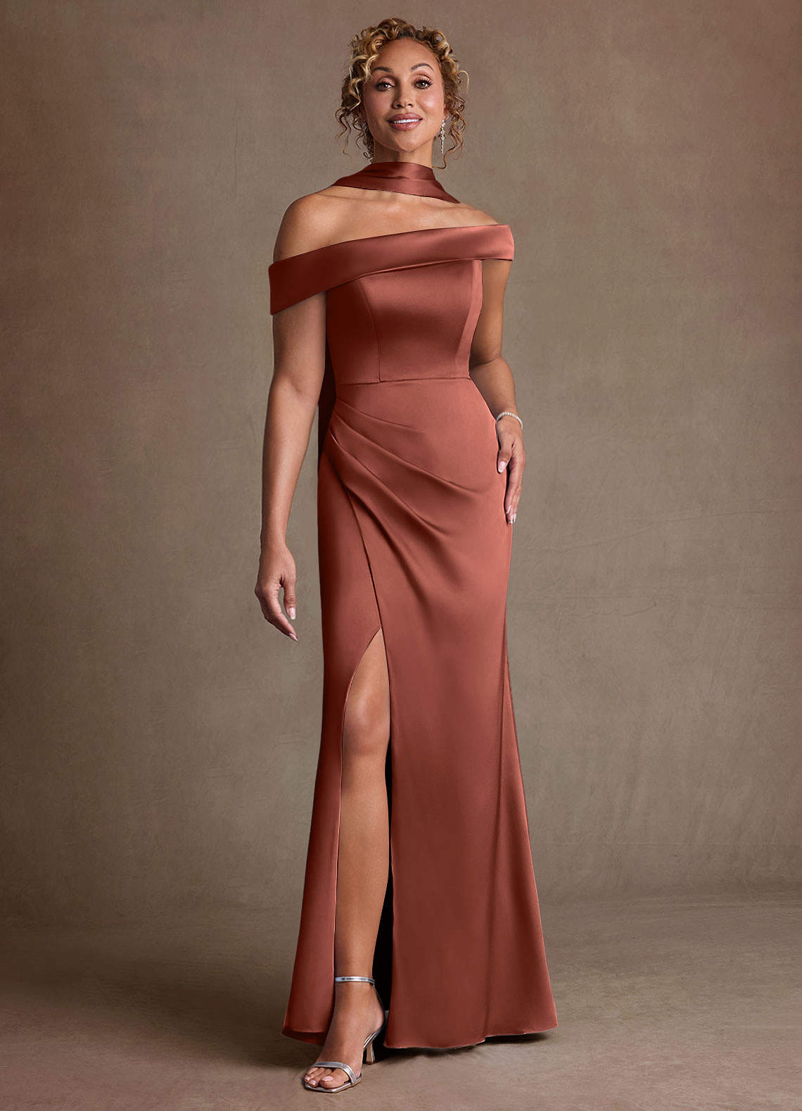 Azazie Kamala 신부의 어머니 드레스 쉬스 한쪽 어깨 스트레치 새틴 플로어 길이 드레스 image1