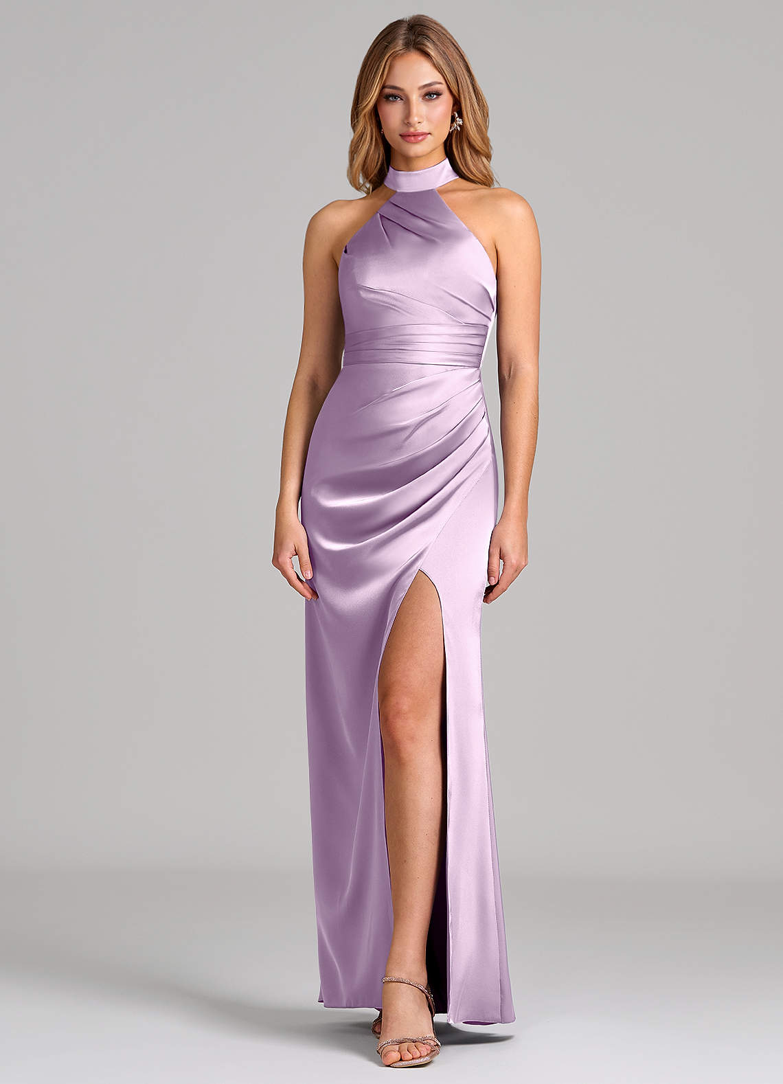 쉬스 주름진 스트레치 새틴 바닥 길이 드레스