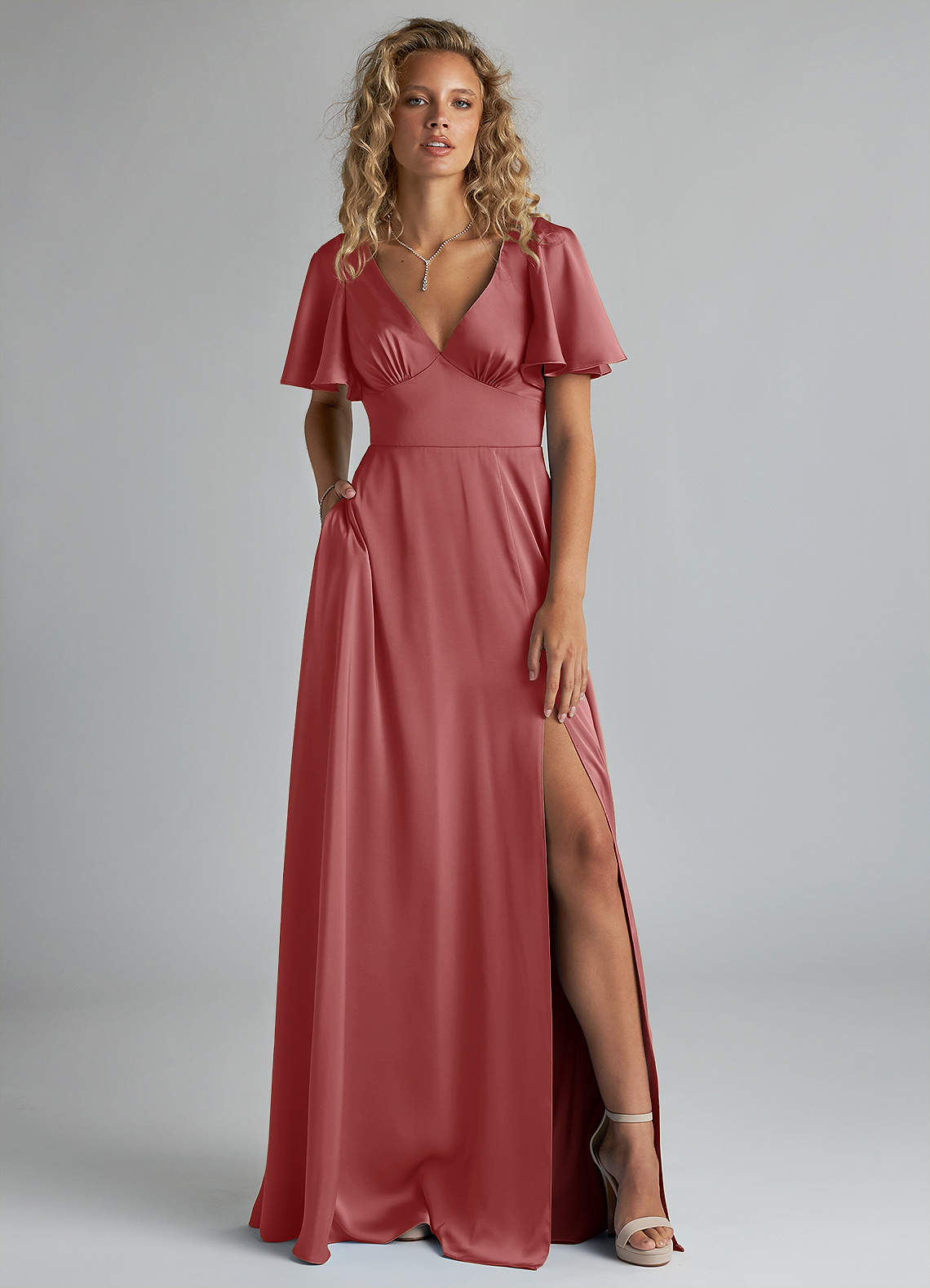 A라인 셔링 스트레치 새틴 바닥 길이 드레스