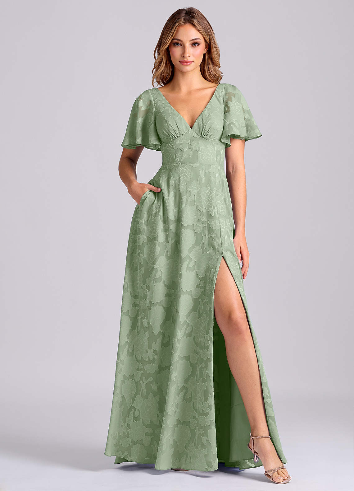 A라인 포켓이 있는 플로럴 번아웃 바닥 길이 드레스