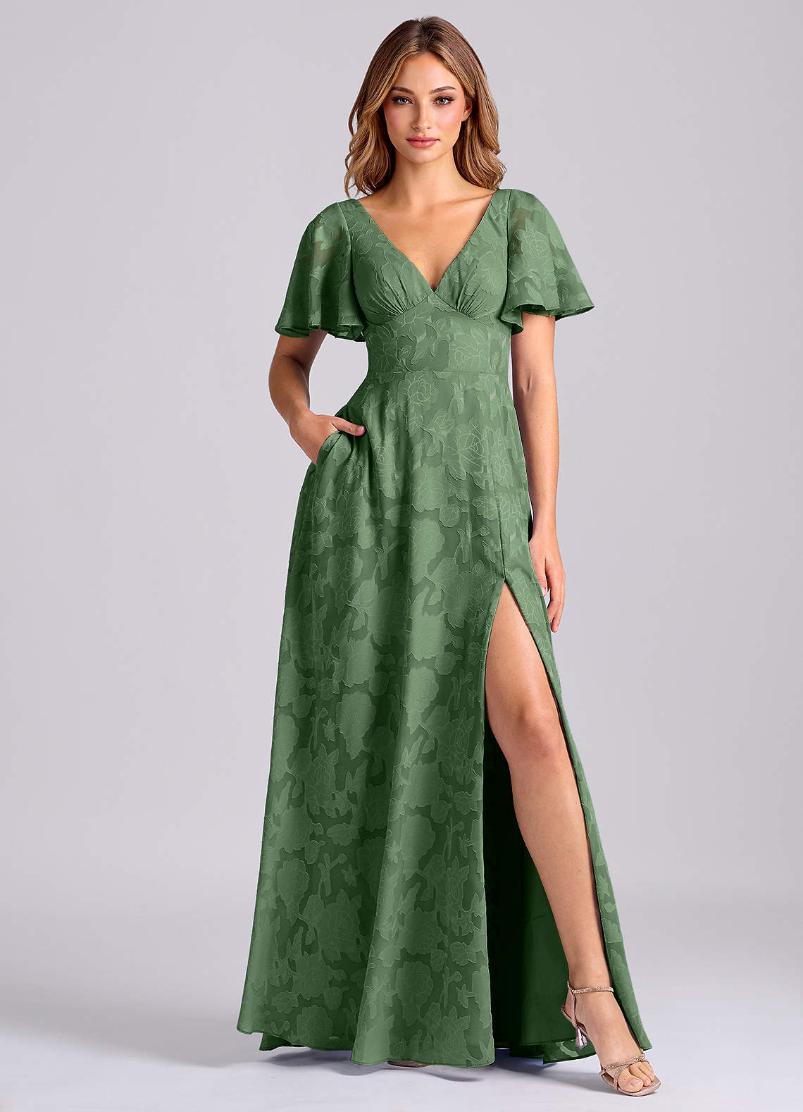 A라인 포켓이 있는 플로럴 번아웃 바닥 길이 드레스