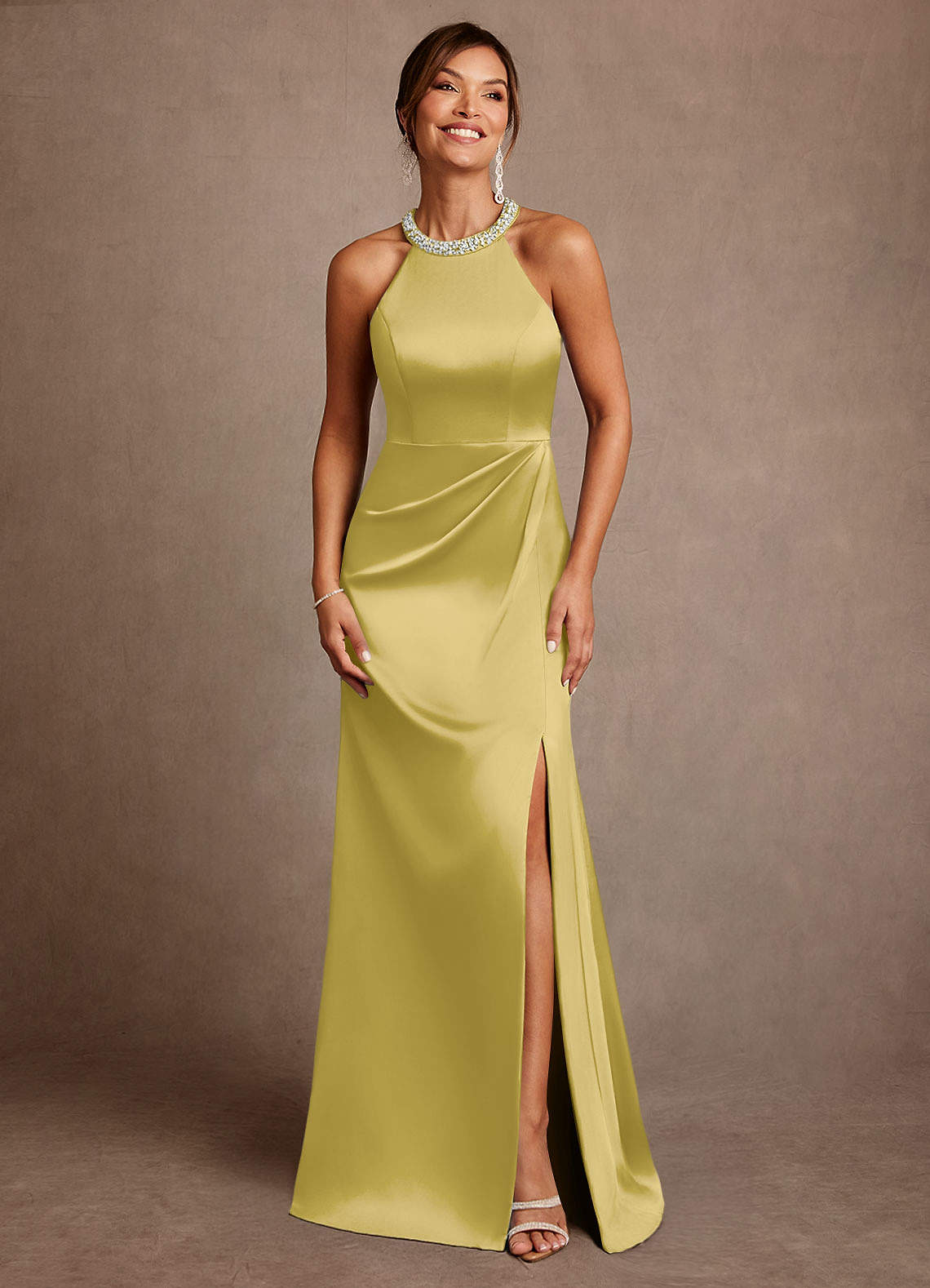 A라인 주름진 스트레치 새틴 플로어 길이 드레스