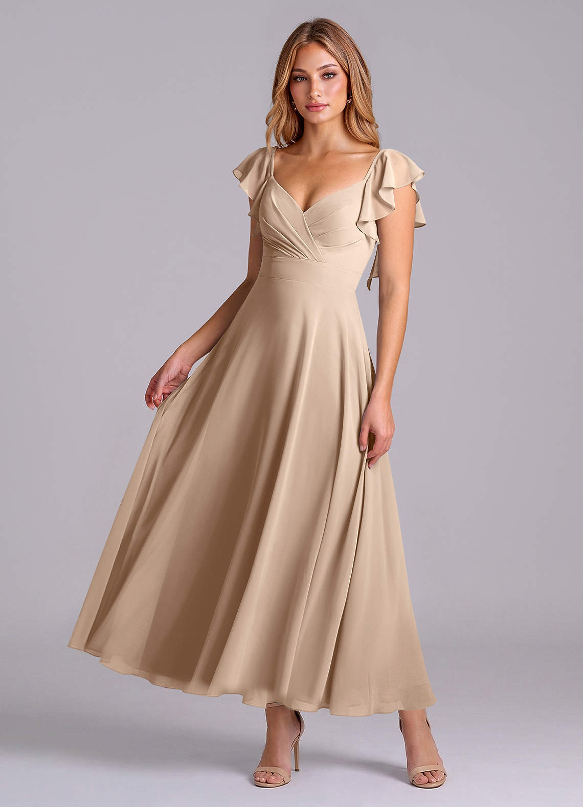 Azazie Leilani 신부 들러리 드레스 A라인 셔링 쉬폰 발목 길이 드레스 image1