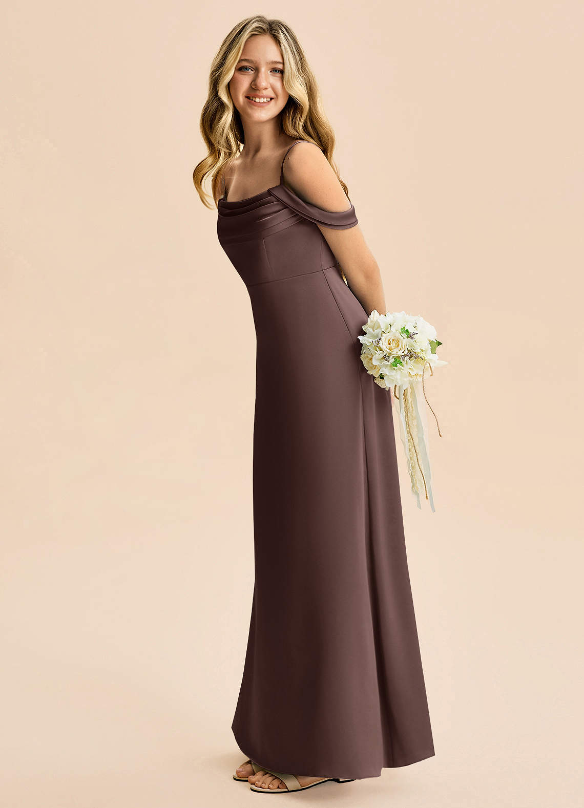 A라인 오프 더 숄더 스트레치 새틴 플로어 길이 주니어 신부 들러리 드레스