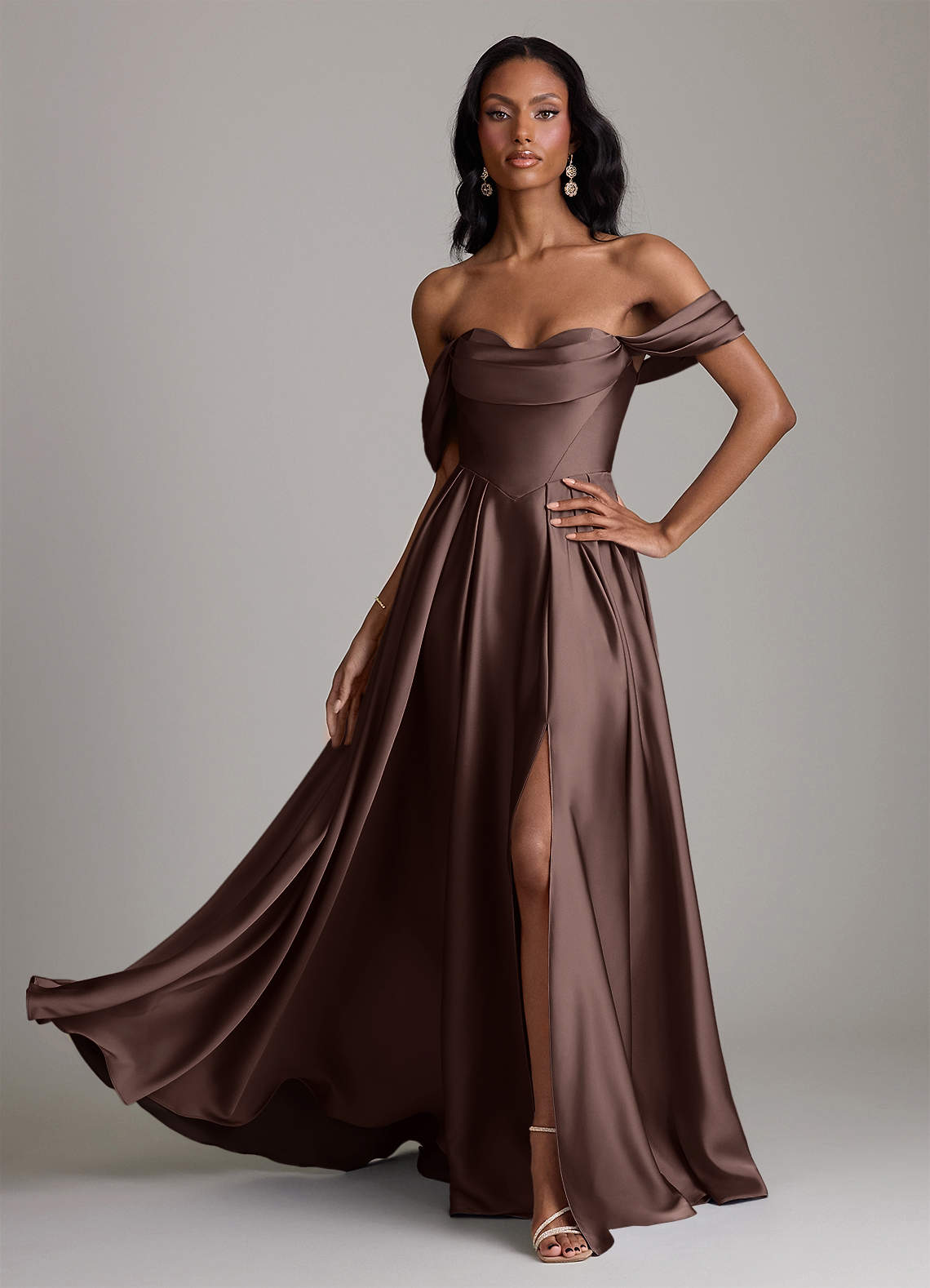 A라인 오프 더 숄더 스트레치 새틴 바닥 길이 드레스