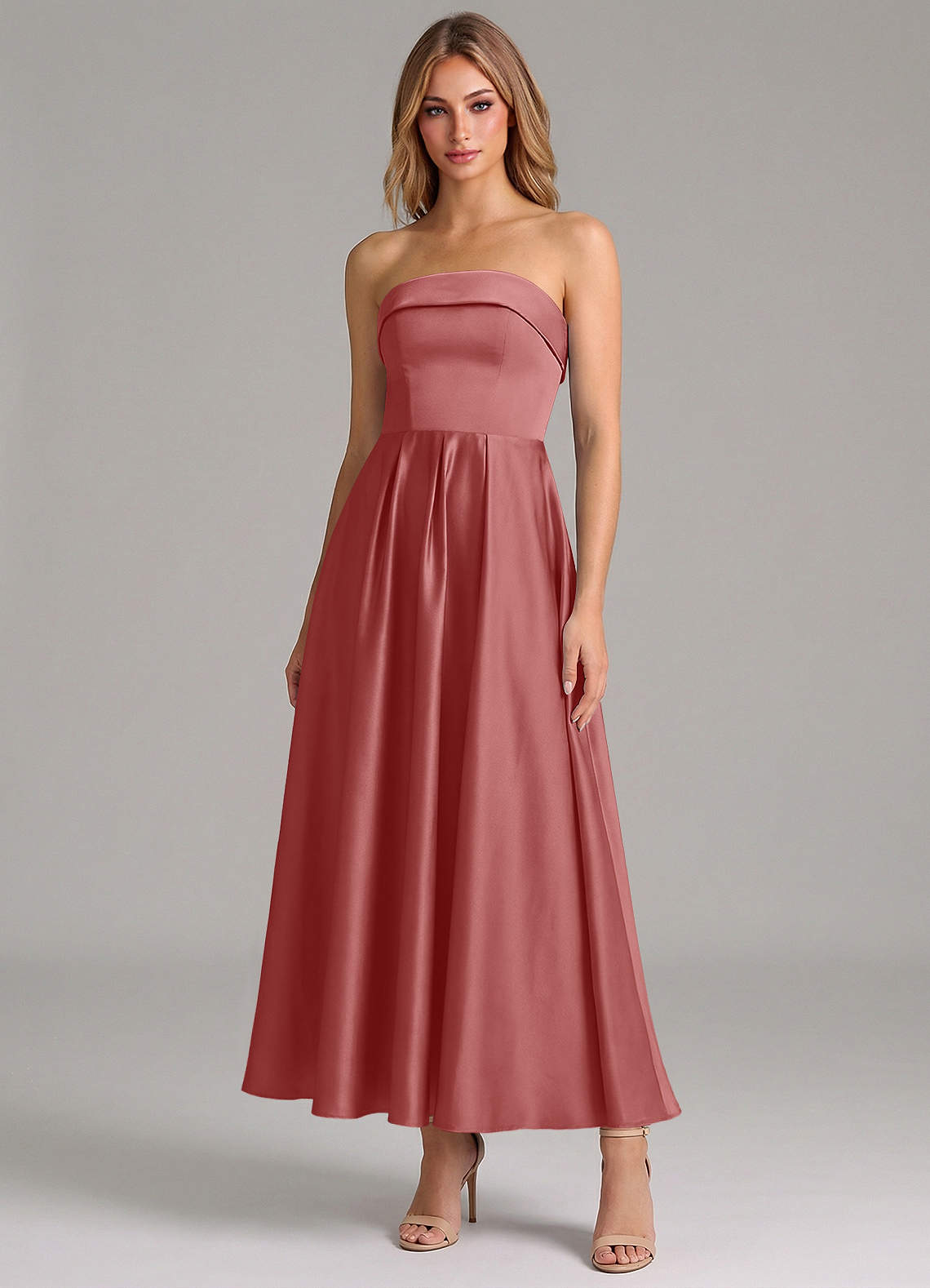 A라인 주름진 스트레치 새틴 발목 길이 드레스