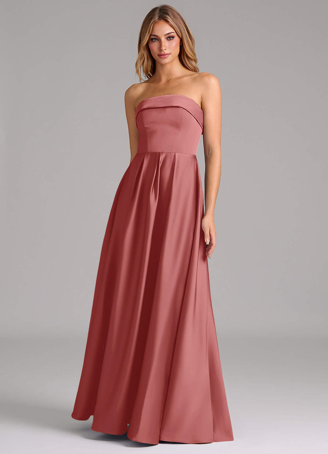 A라인 스트랩리스 스트레치 새틴 바닥 길이 드레스