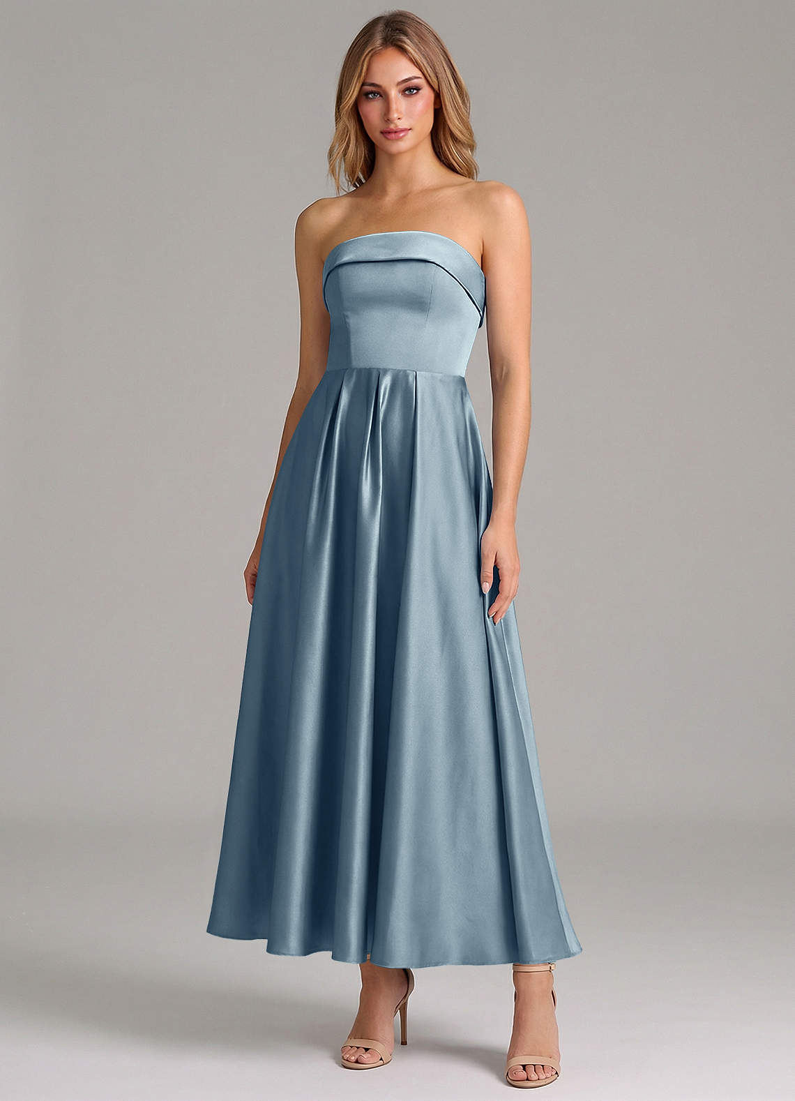 A라인 주름진 스트레치 새틴 발목 길이 드레스