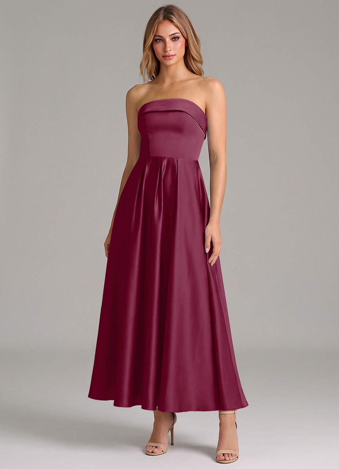 A라인 주름진 스트레치 새틴 발목 길이 드레스
