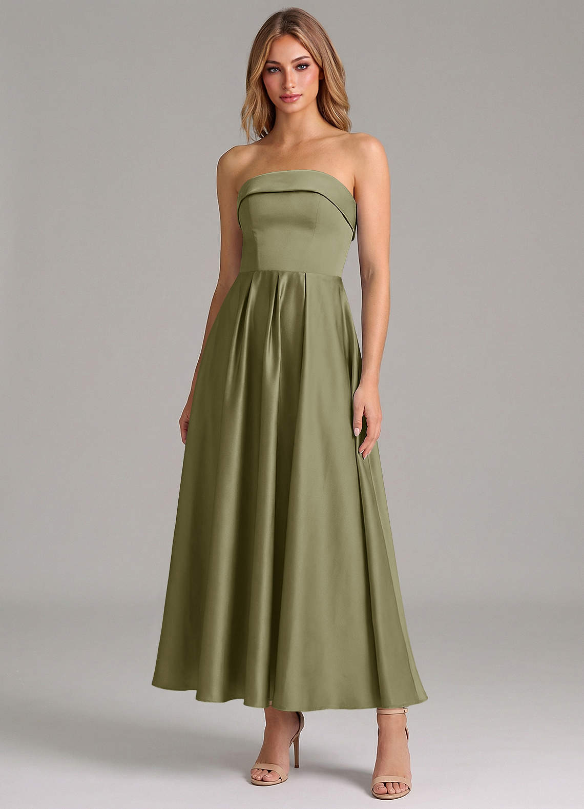 Azazie Lucienne 신부 들러리 드레스 A라인 주름진 스트레치 새틴 발목 길이 드레스 image1