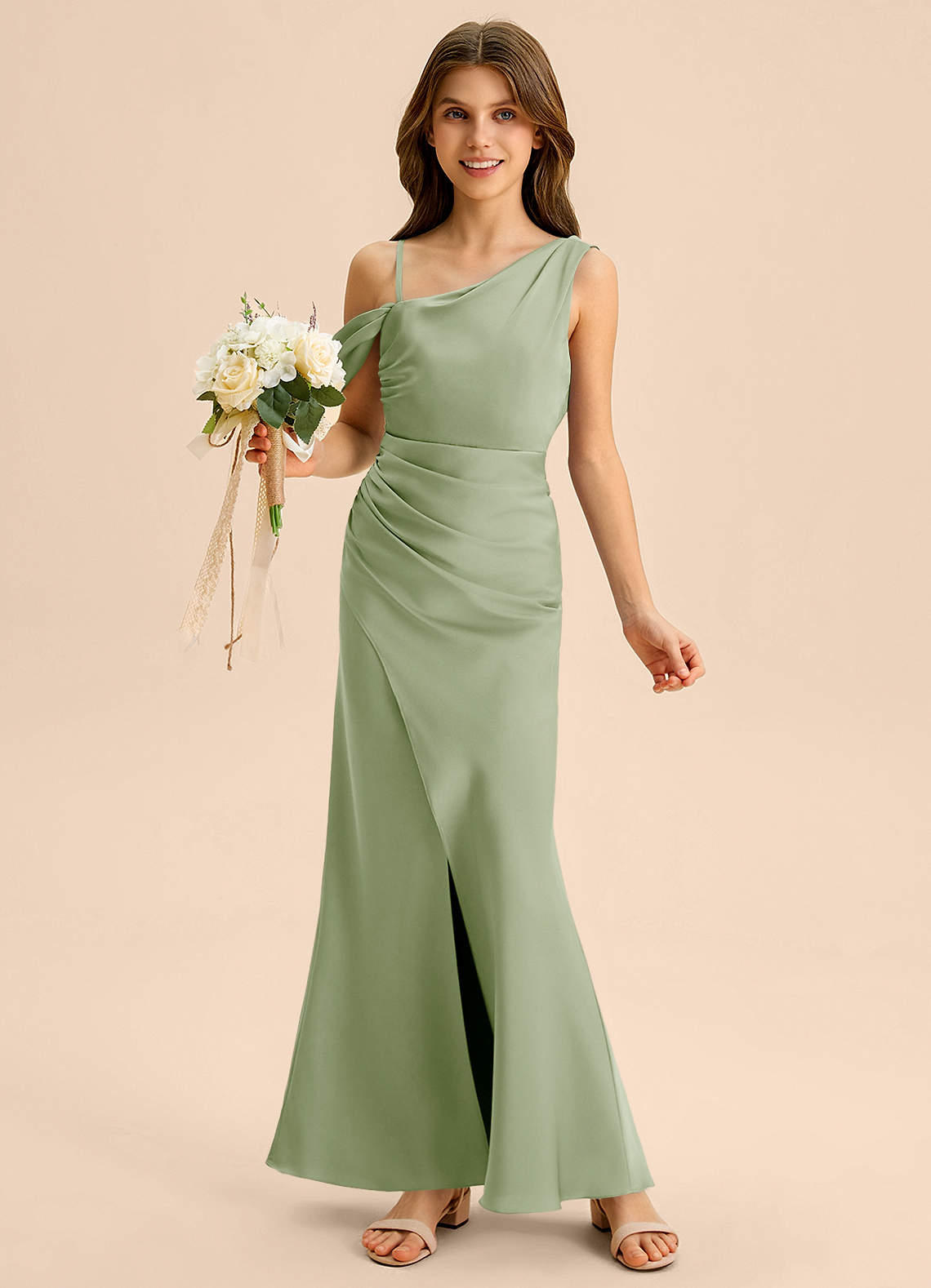 쉬스 오프 더 숄더 스트레치 새틴 플로어 길이 주니어 신부 들러리 드레스