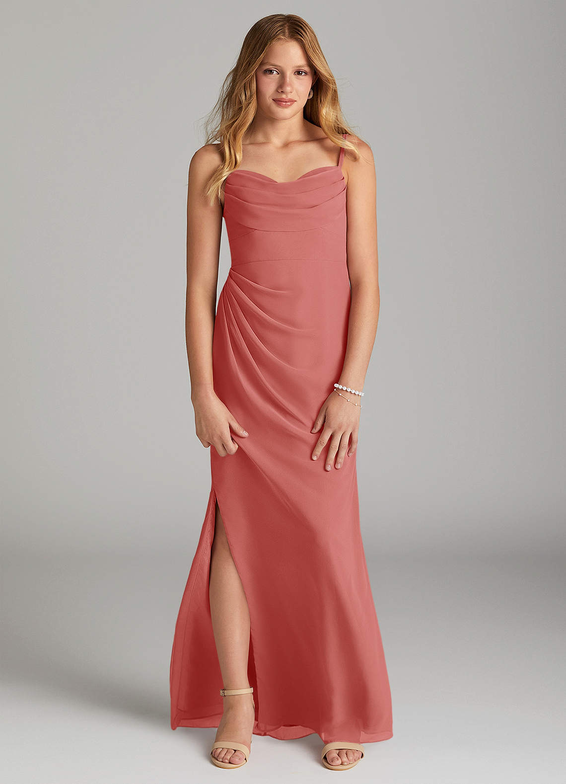 쉬스 주름진 쉬폰 플로어 길이 주니어 신부 들러리 드레스