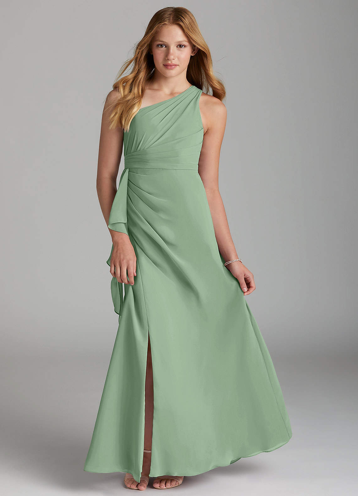 A라인 주름진 쉬폰 플로어 길이 주니어 신부 들러리 드레스
