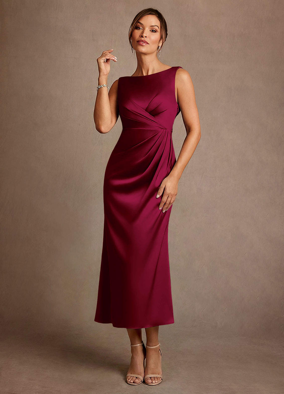 A라인 주름진 스트레치 새틴 티 길이 드레스