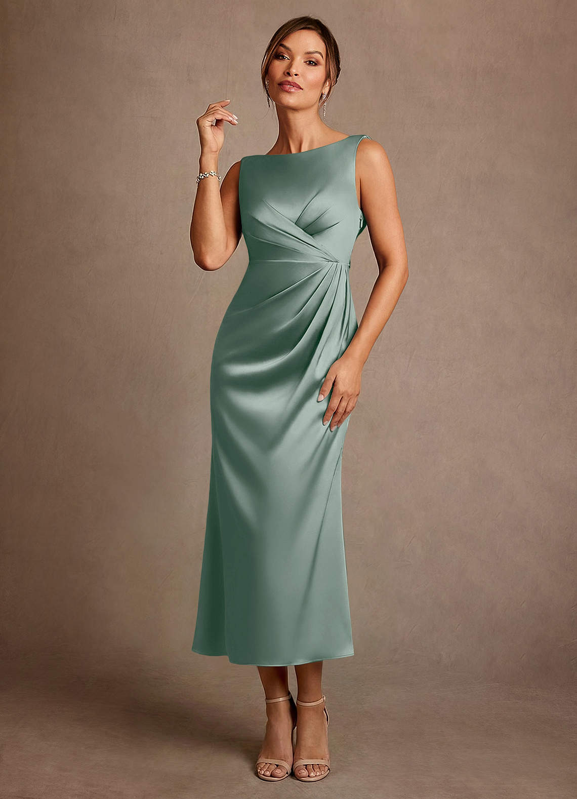 Azazie Mazhe 신부의 어머니 드레스 A라인 주름진 스트레치 새틴 티 길이 드레스 image1