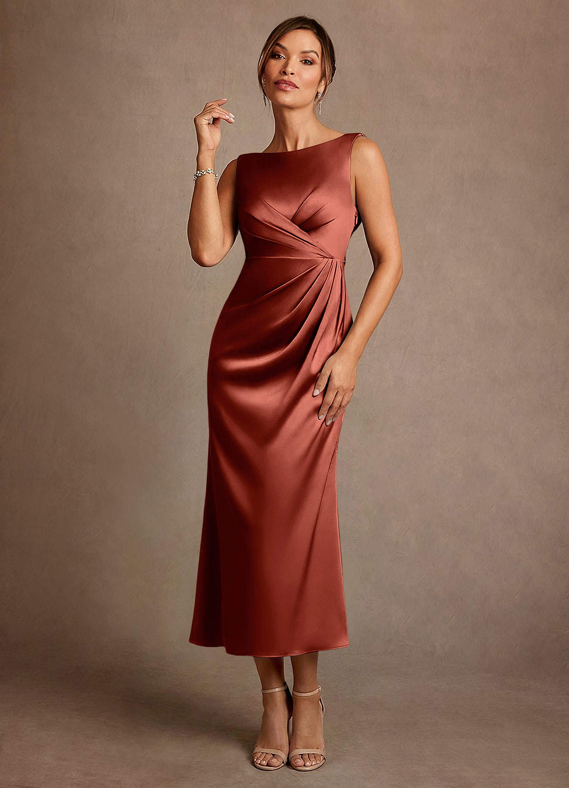 A라인 주름진 스트레치 새틴 티 길이 드레스