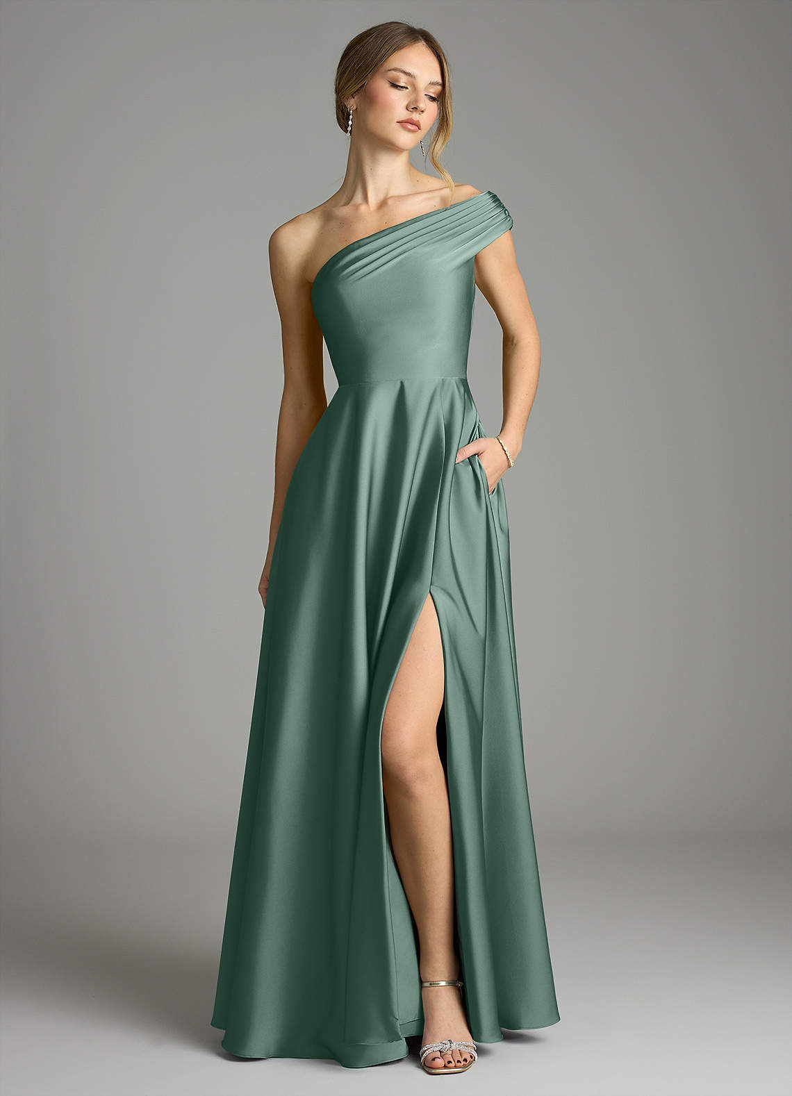 A라인 오프 더 숄더 스트레치 새틴 바닥 길이 드레스