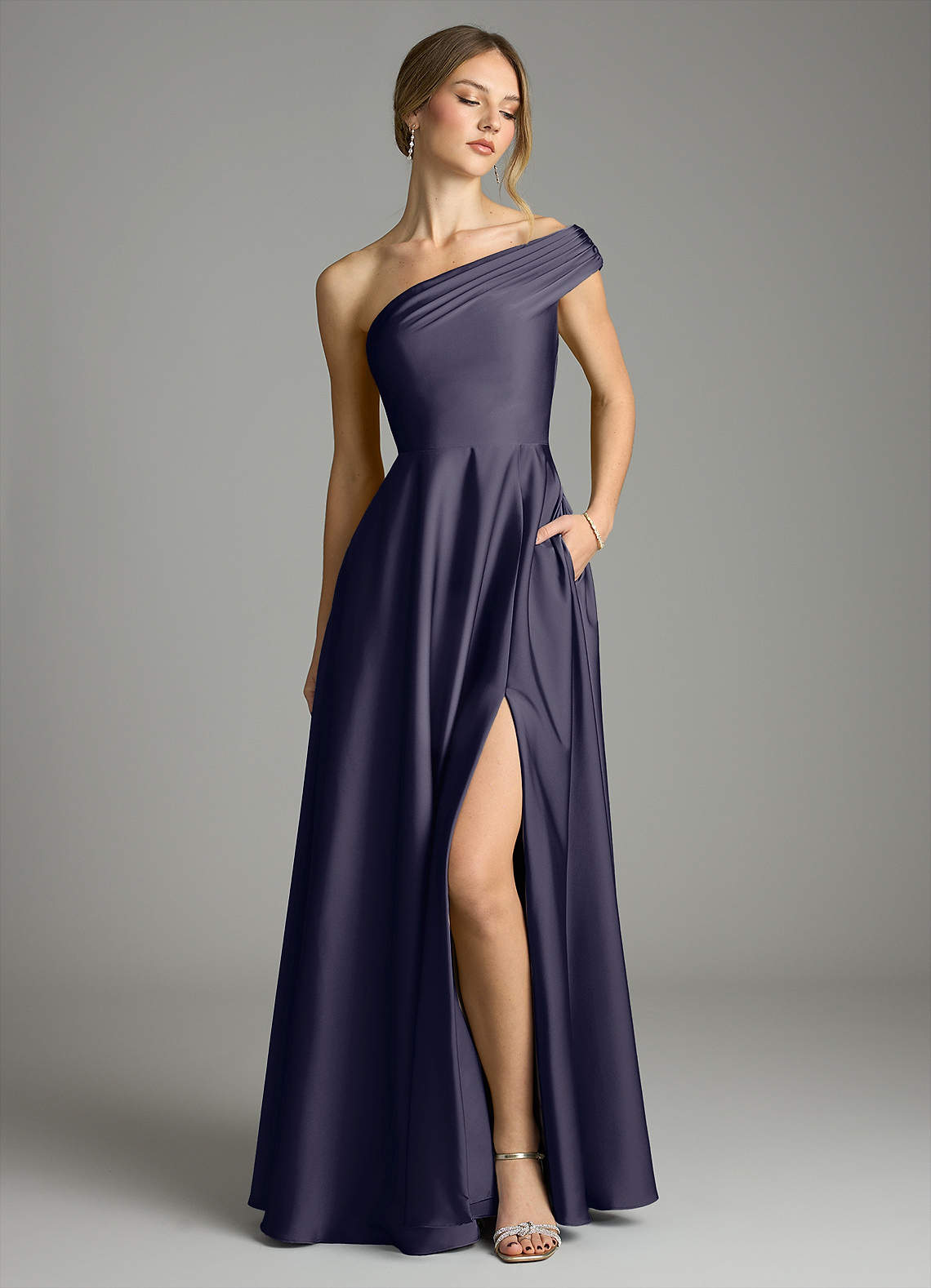 A라인 오프 더 숄더 스트레치 새틴 바닥 길이 드레스