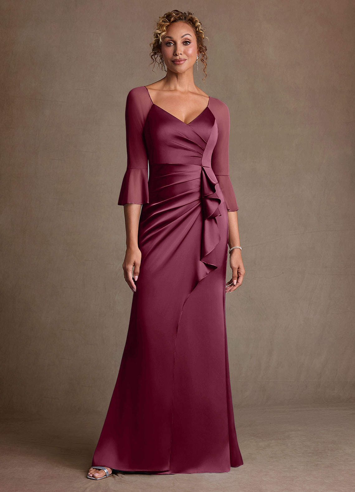 쉬스 주름진 망사 플로어 길이 드레스