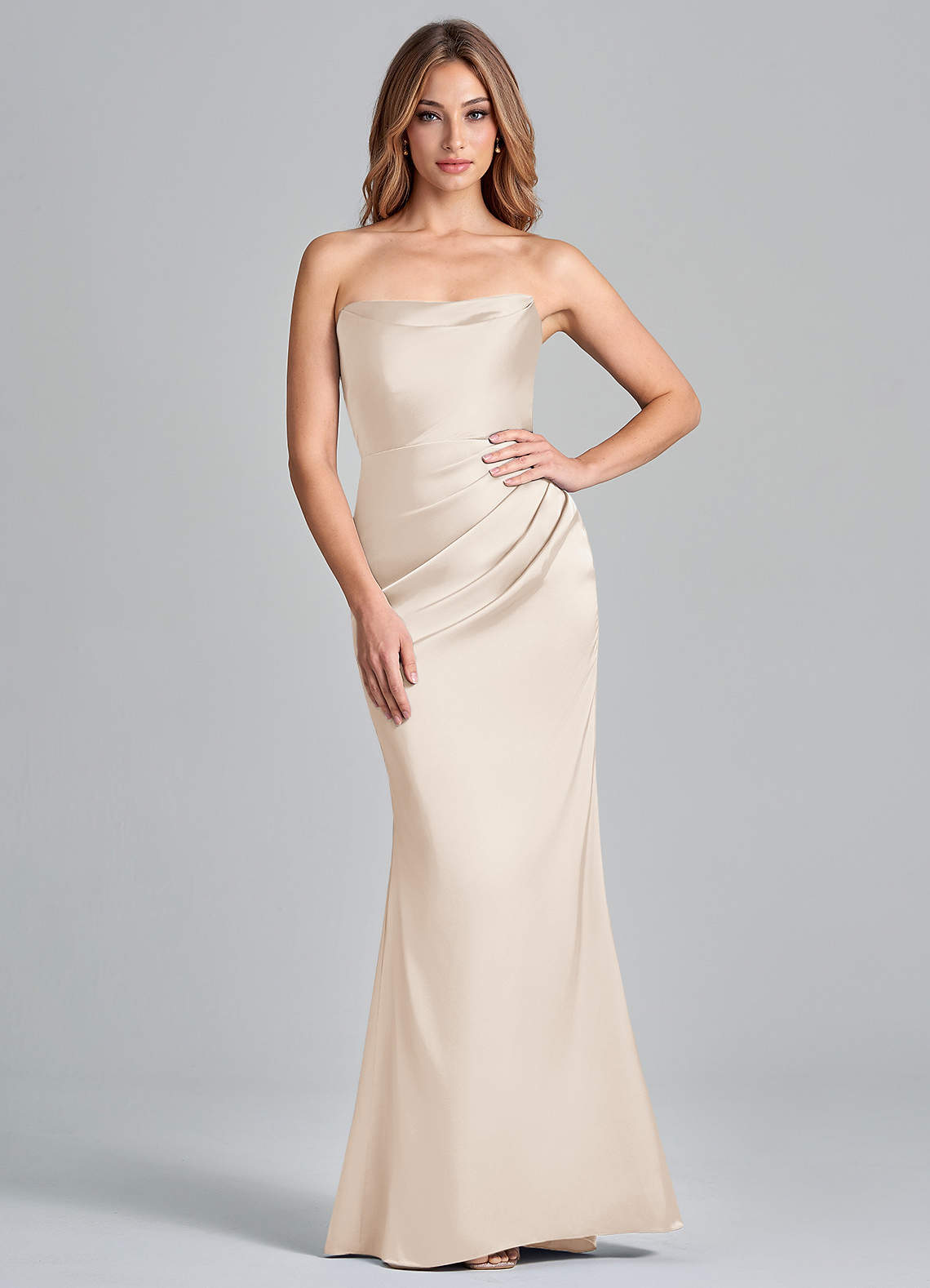 Azazie Olea 신부 들러리 드레스 인어 스트랩리스 스트레치 새틴 바닥 길이 드레스 image1