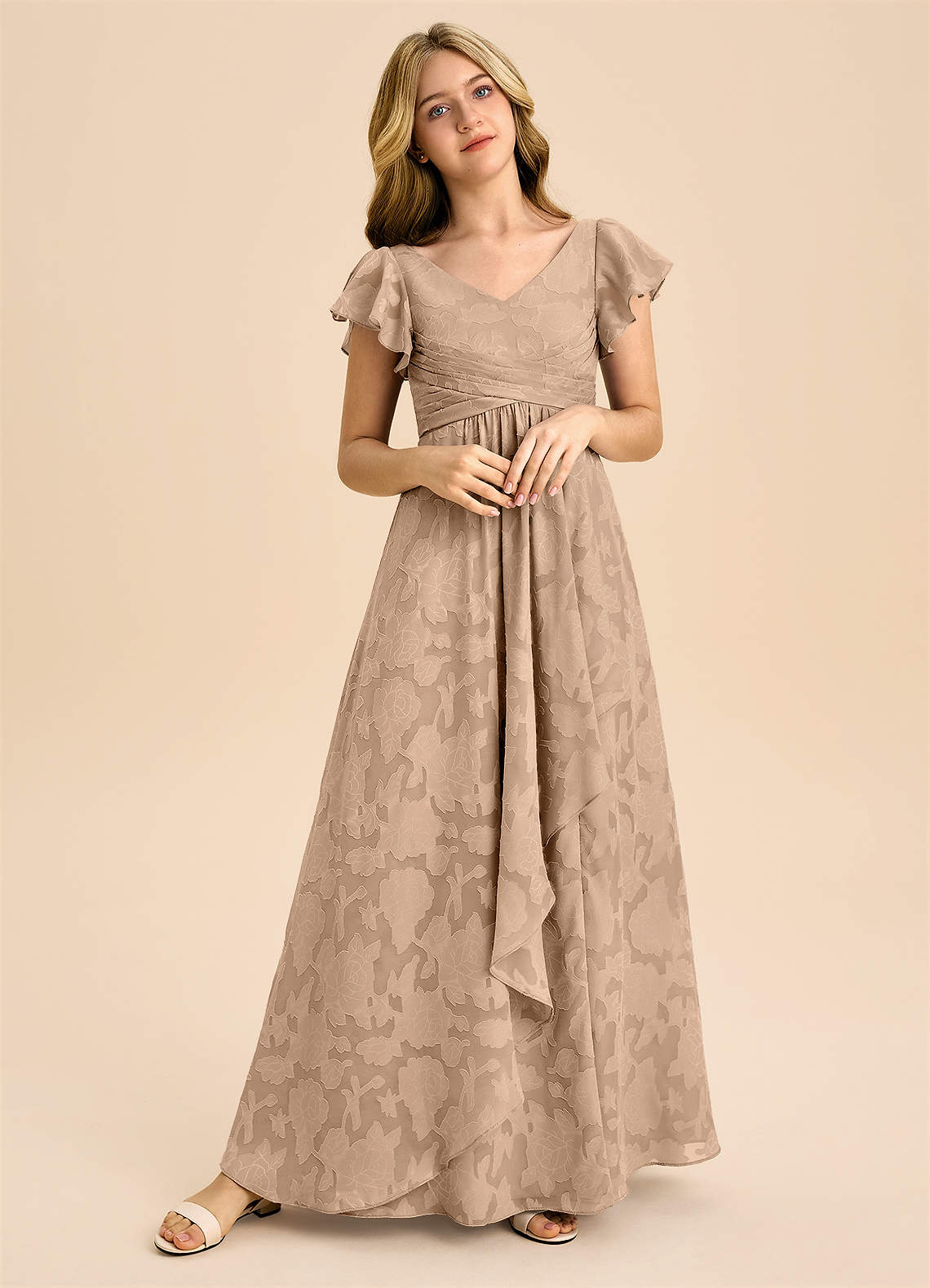 A라인 주름진 플로럴 번아웃 플로어 길이 주니어 신부 들러리 드레스