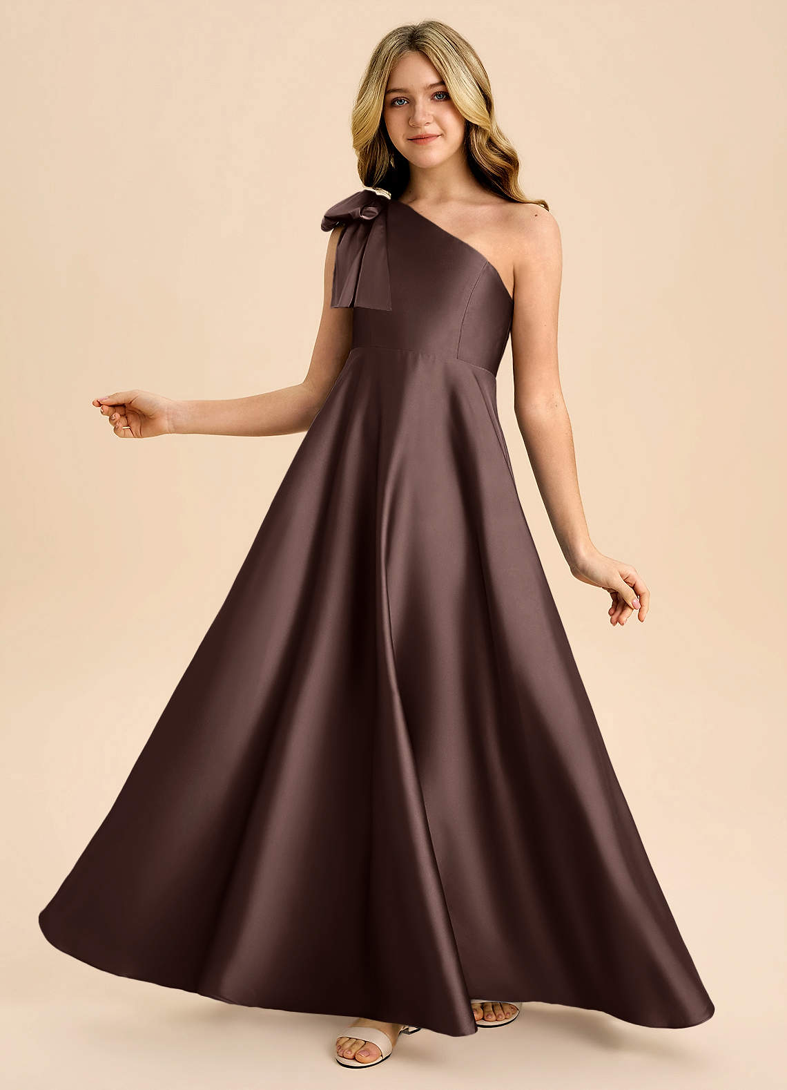 A라인 절하다 스트레치 새틴 플로어 길이 주니어 신부 들러리 드레스