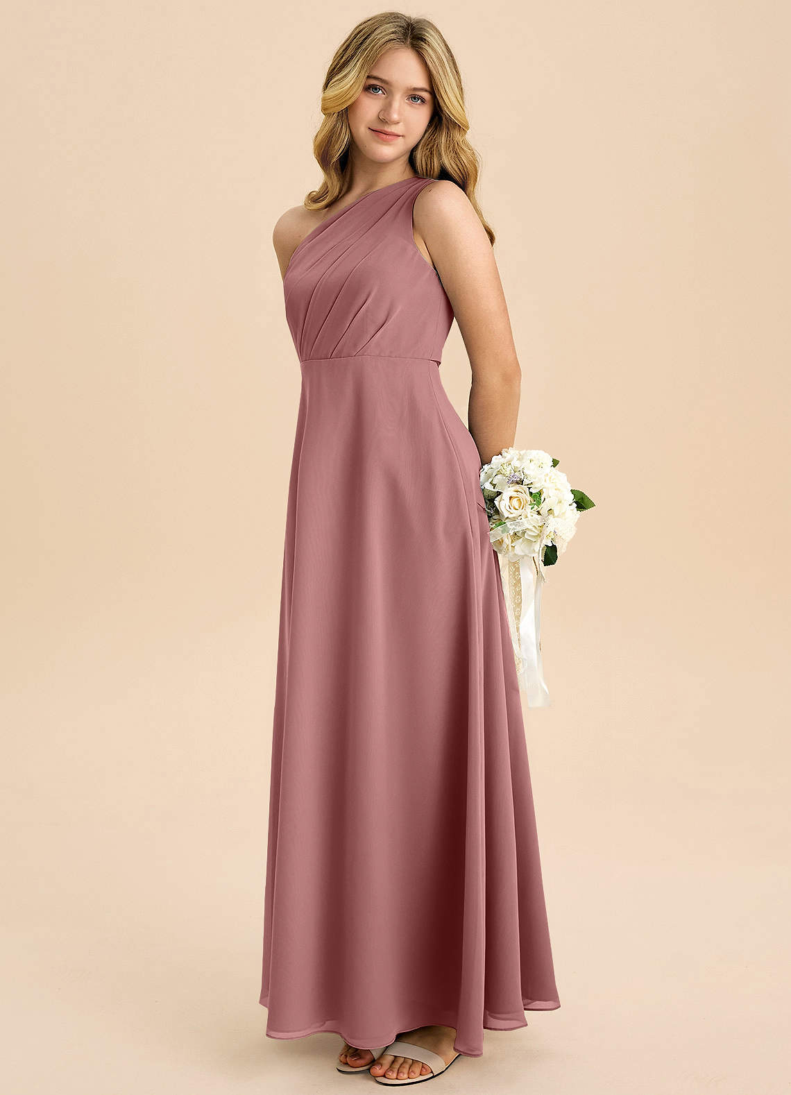 A라인 주름진 쉬폰 플로어 길이 주니어 신부 들러리 드레스
