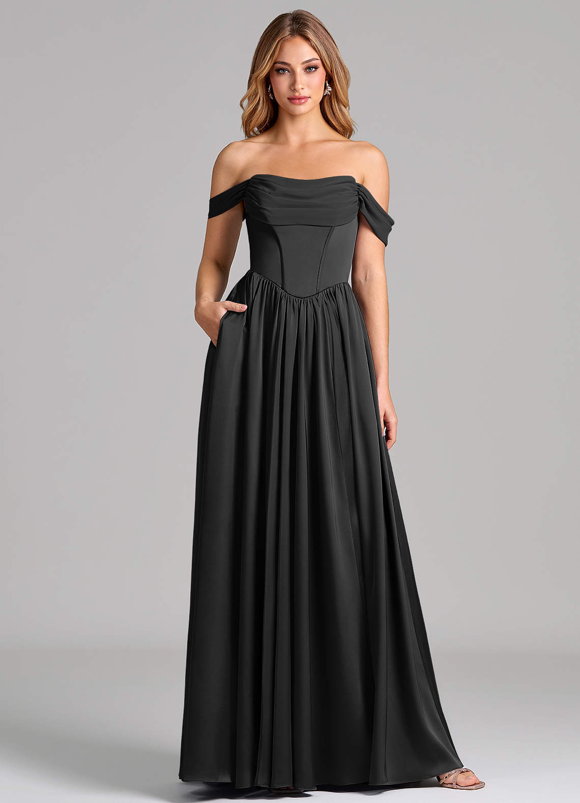 A라인 오프 더 숄더 스트레치 새틴 바닥 길이 드레스