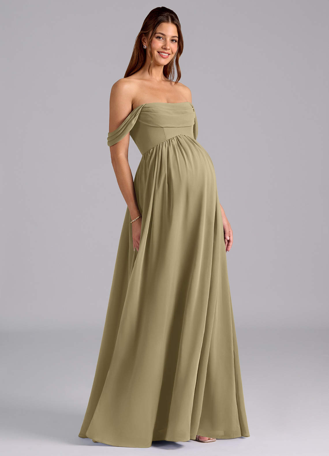 A라인 주름진 쉬폰 플로어 길이 드레스 모스 그린