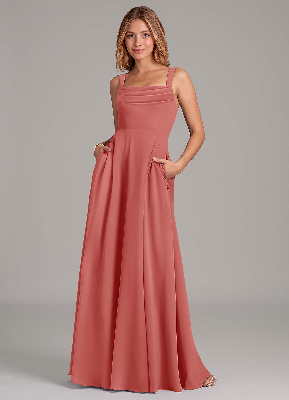 A라인 주름진 쉬폰 바닥 길이 드레스