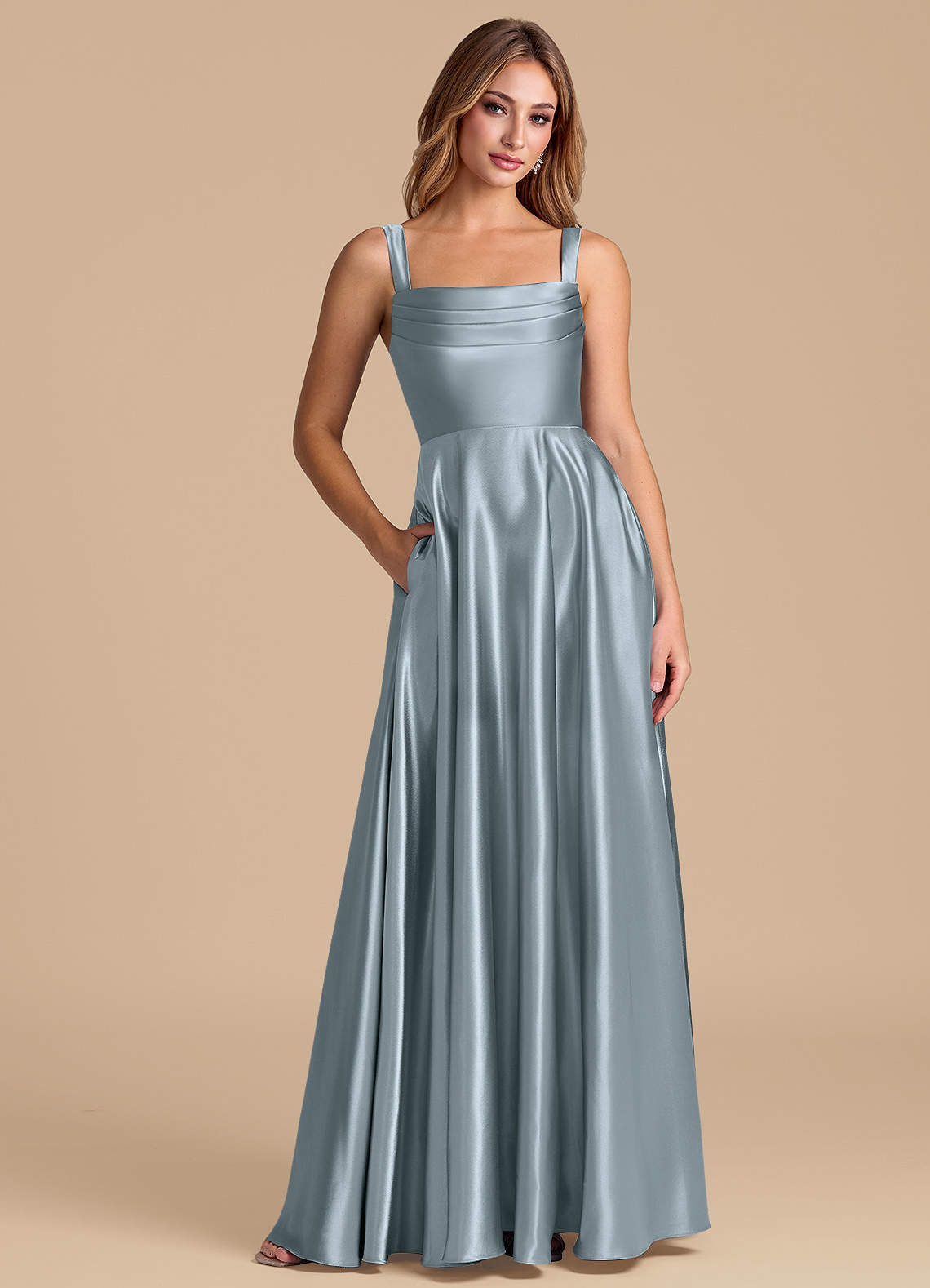 A라인 주름진 메탈릭 새틴 바닥 길이 드레스