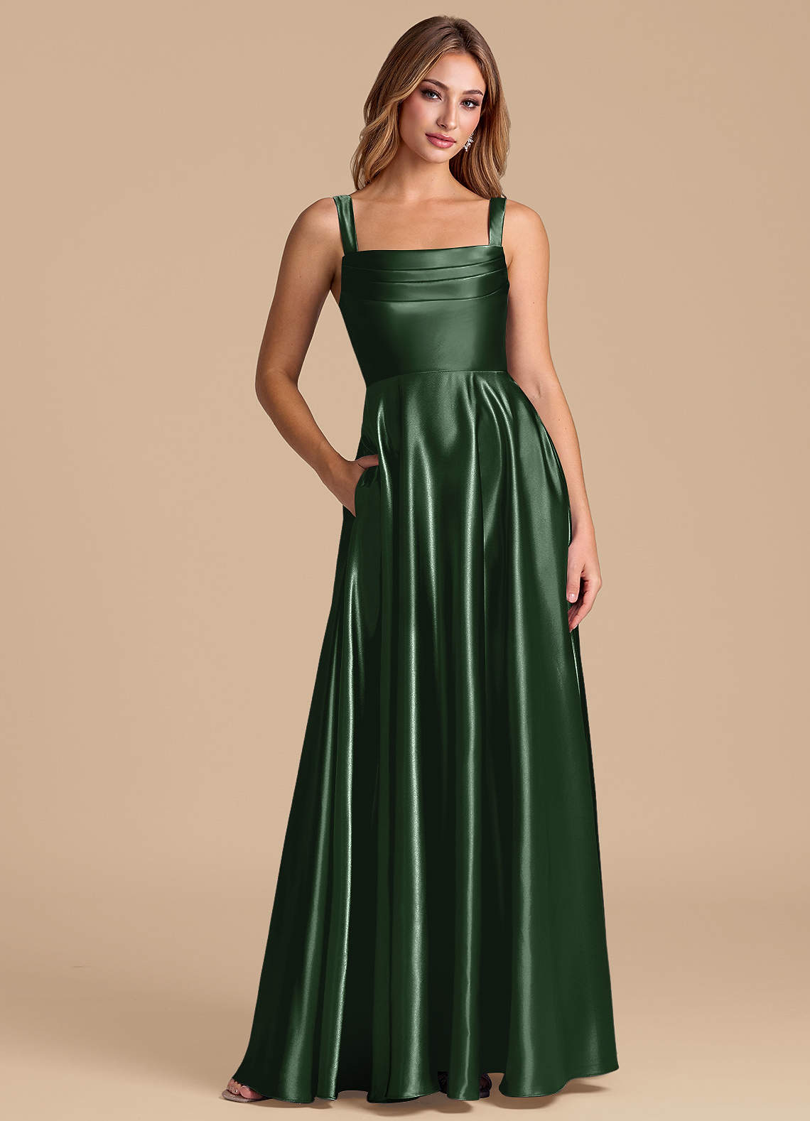 Azazie Shaude 신부 들러리 드레스 A라인 주름진 메탈릭 새틴 바닥 길이 드레스 image1