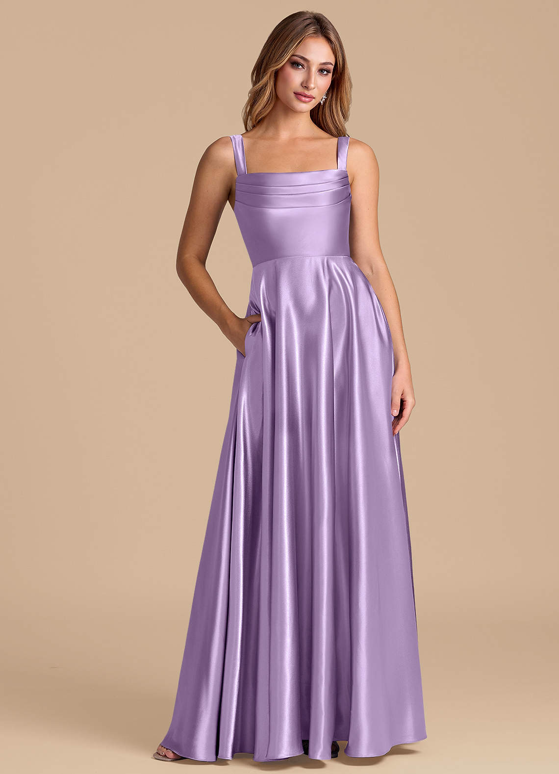 A라인 주름진 메탈릭 새틴 바닥 길이 드레스