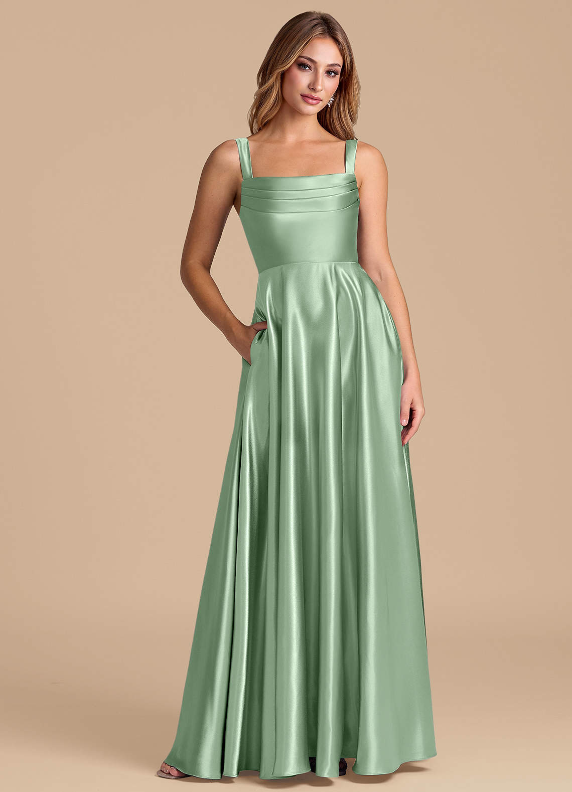 Azazie Shaude 신부 들러리 드레스 A라인 주름진 메탈릭 새틴 바닥 길이 드레스 image1