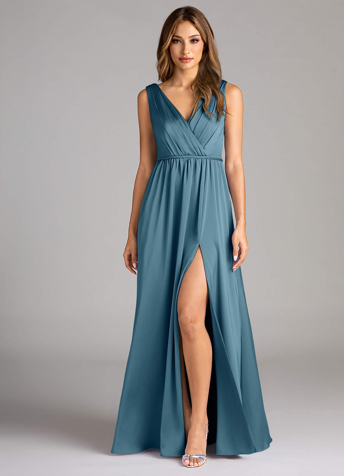 A라인 주름진 스트레치 새틴 바닥 길이 드레스