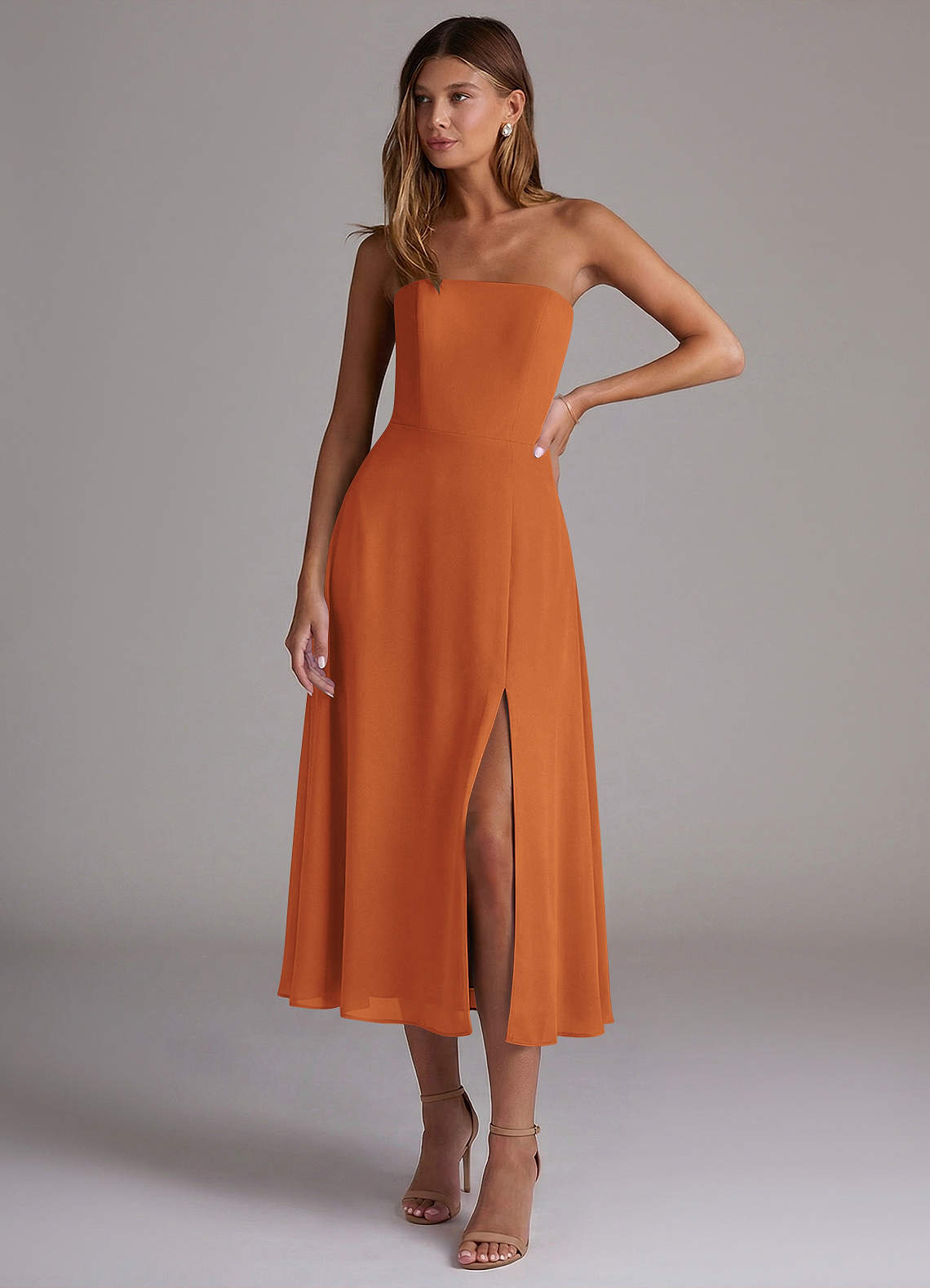 Azazie Wren 신부 들러리 드레스 A라인 스트랩리스 쉬폰 티 길이 드레스 image1