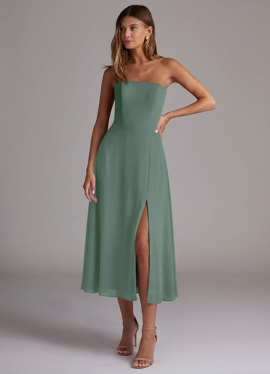 A라인 스트랩리스 쉬폰 티 길이 드레스