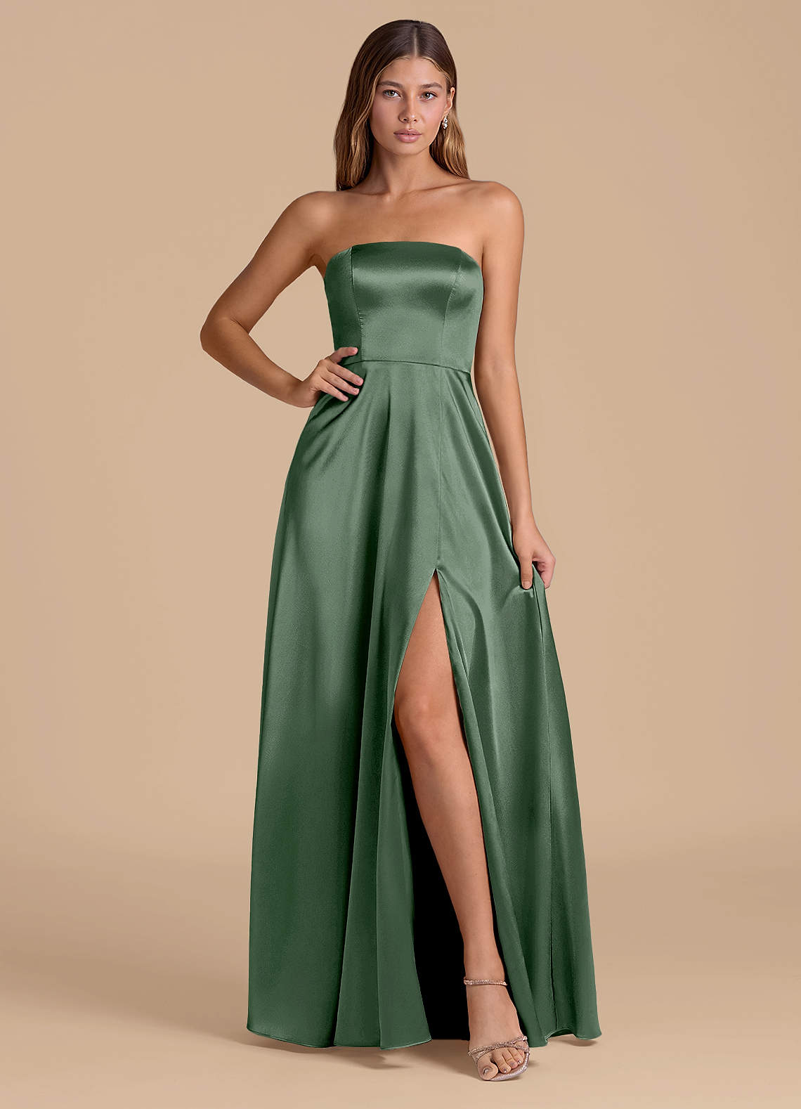 A라인 스트랩리스 메탈릭 새틴 바닥 길이 드레스